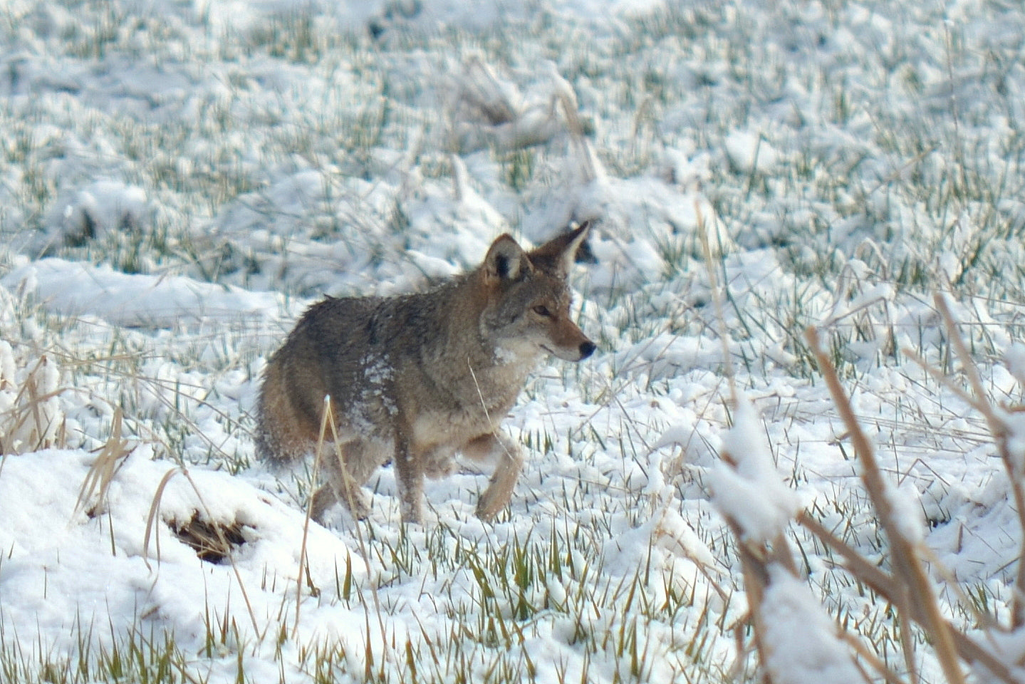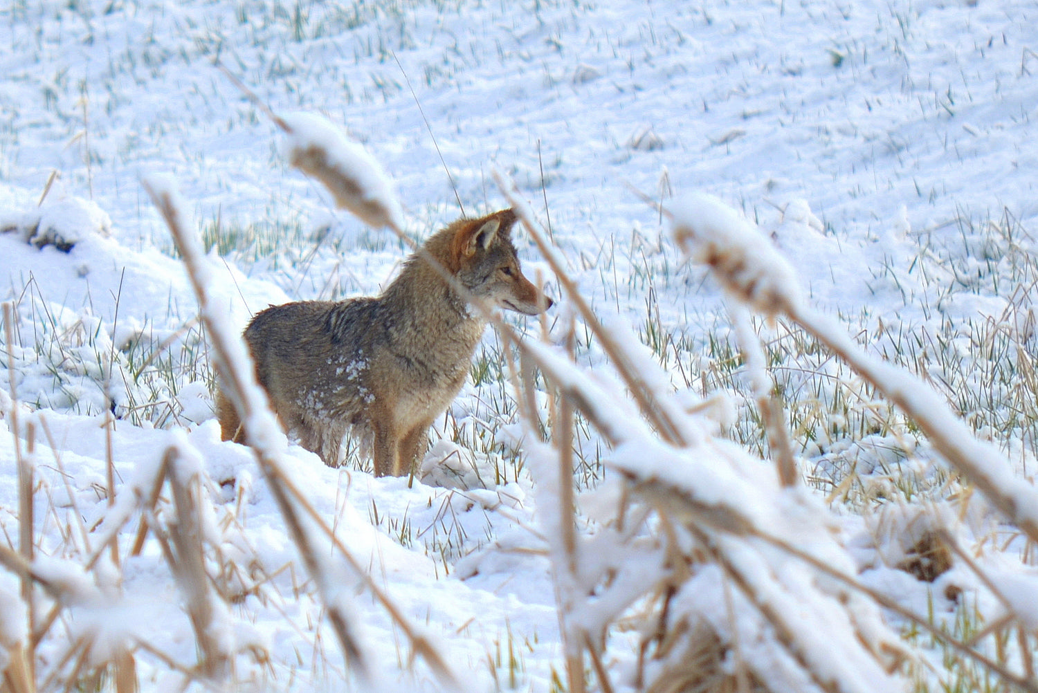 I woke up mid April to fresh snow on the ground. I often think that with fresh snow, it is always easier to see wildlife and their tracks. I saw my cat starring at something and soon discovered there was a coyote out in the pasture below my house looking for some breakfast. I took a few shots of him from my kitchen window. He was good looking and may need to be painted. Be on the lookout for a painting. Maybe entitled "Coyote Morning" ... Cheers!
