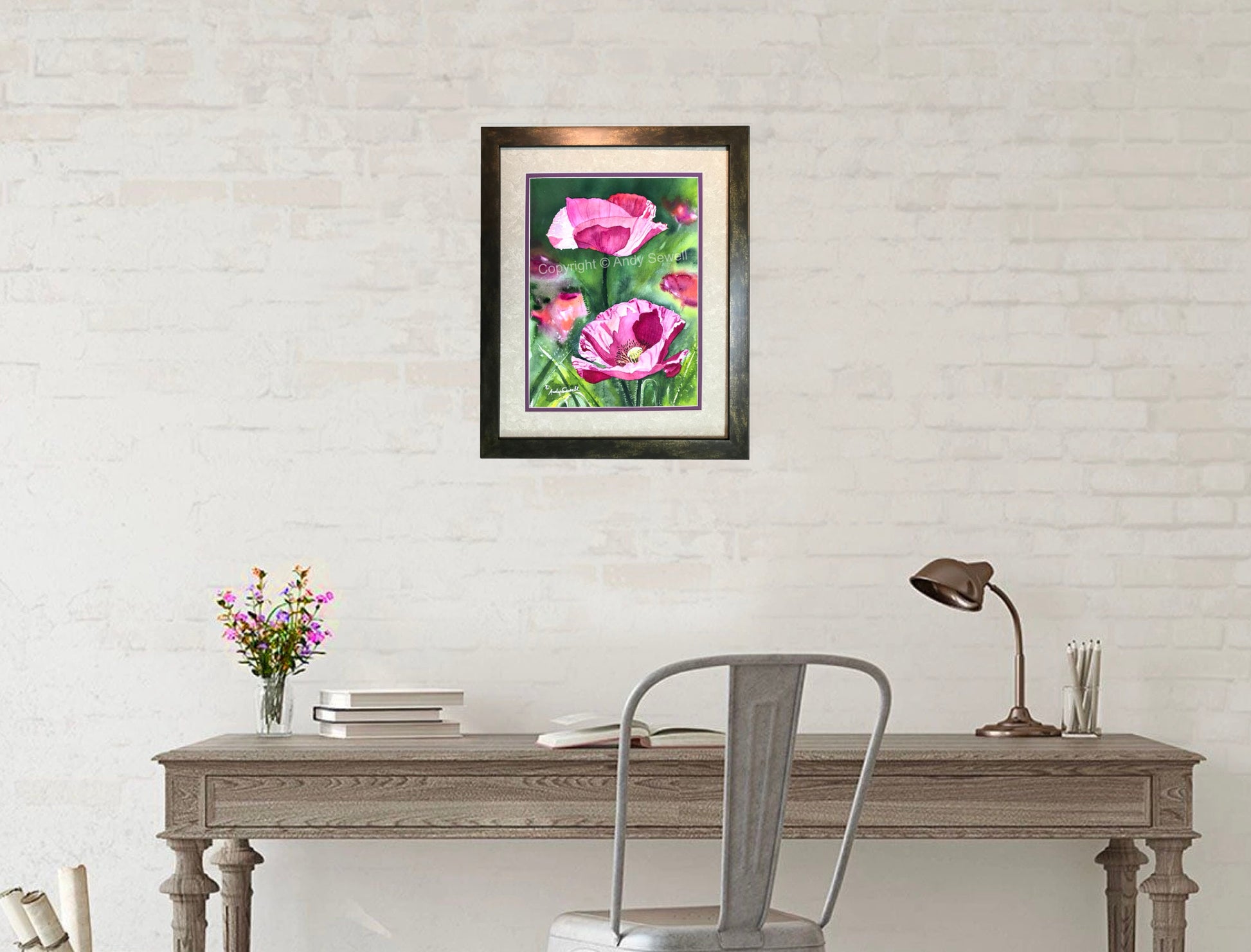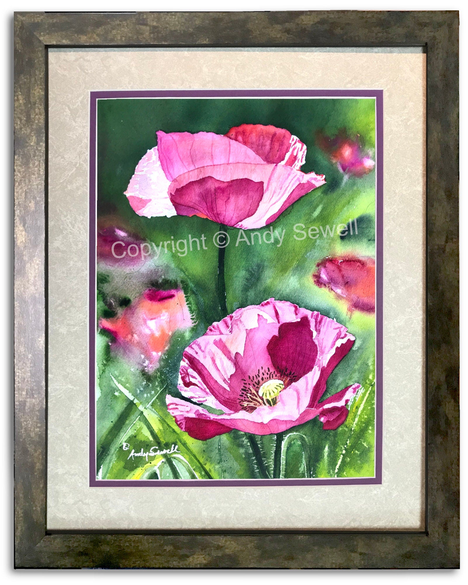a "Pink Poppy duo" Art Print - an original or giclee art print from an original watercolor of poppies glowing in the sun - by Andy Sewell