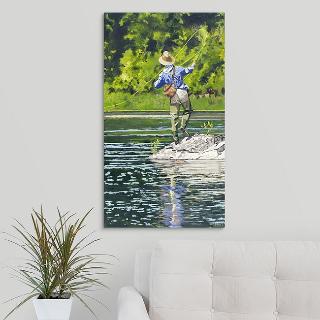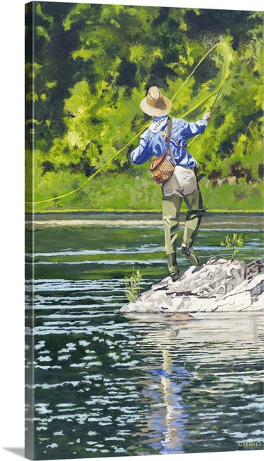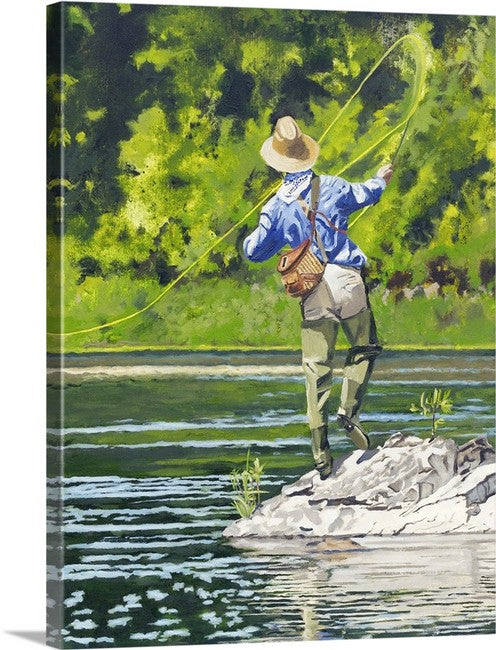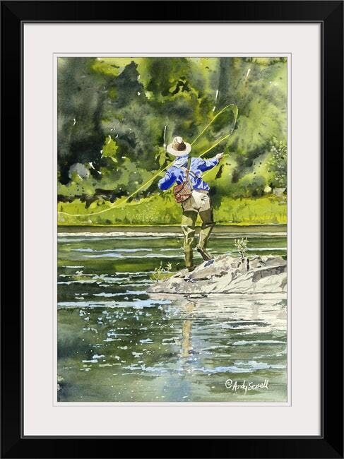 Vintage Fly Fisherman in "good form".This is a beautiful open edition print of my Original oil painting featuring my son fly fishing on a river in Idaho. I painted this image in both oil and watercolor.