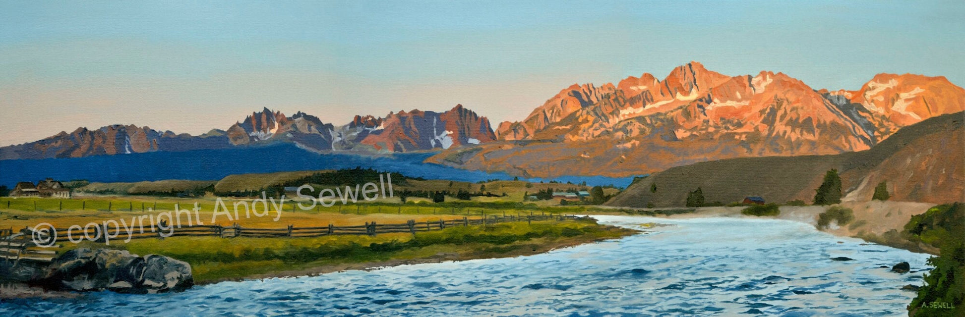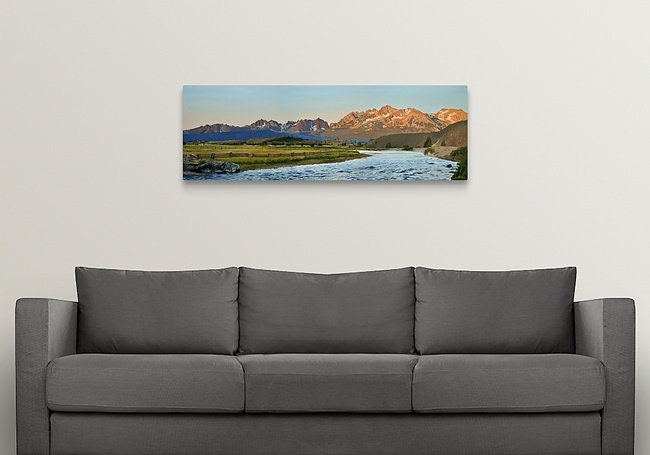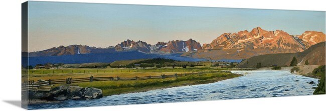 "Salmon River Sunrise“ This is a beautiful 58"x19" Open ed. print (Giclée) of my Original oil painting featuring the view from Lower Stanley of the Salmon River and Sawtooth Sunrise in Idaho. There is no shipping charges on the rolled canvas.