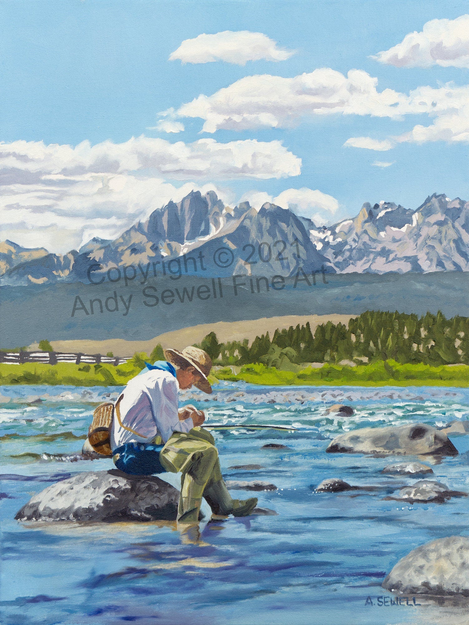 Title: "Sawtooth Solitude" This is a beautiful 18"x24" original oil on canvas available as an open edition signed print (Giclée) from my original oil painting featuring Fishing in the solitude of Idaho's fabulous Upper Salmon River at the base of the Sawtooth Mountains.