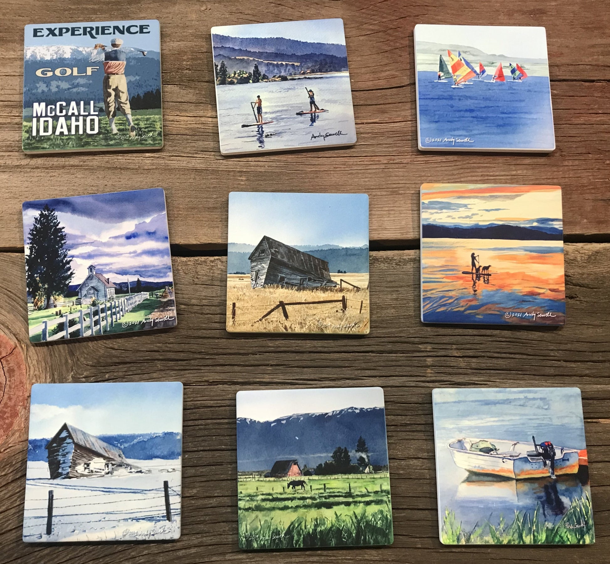 Fine art ceramic coaster. Created by the artist from an original painting. Scratch resistant matte surface with cork backing. The coasters have sharp details and vivid color. They are 3 7/8" square. Many of the images come in sets. If there is shown a themed set of four, each coaster must be purchased separately. You can search for your favorite subjects. Mix and match any combination of coasters to create your own matching or custom set. I also offer each of the images in fine art prints. Visit www.finewatercolors.com to see more available art. If you don't see the print available, email me and I will make the print available. This image is part of my "McCall Area" series