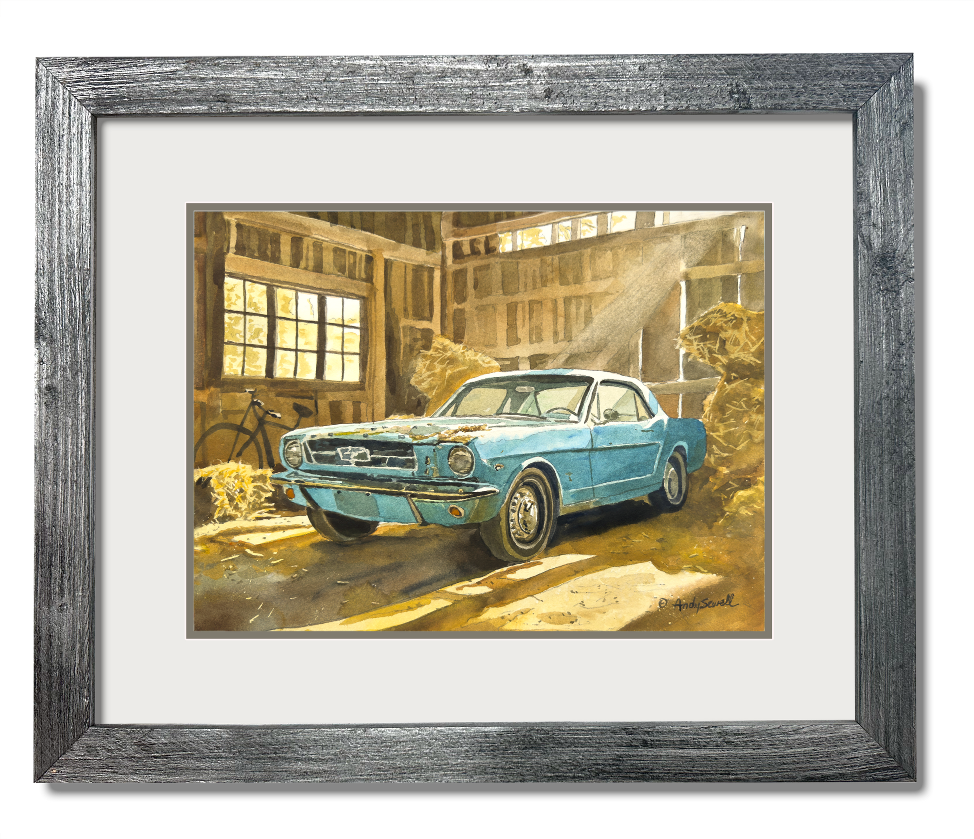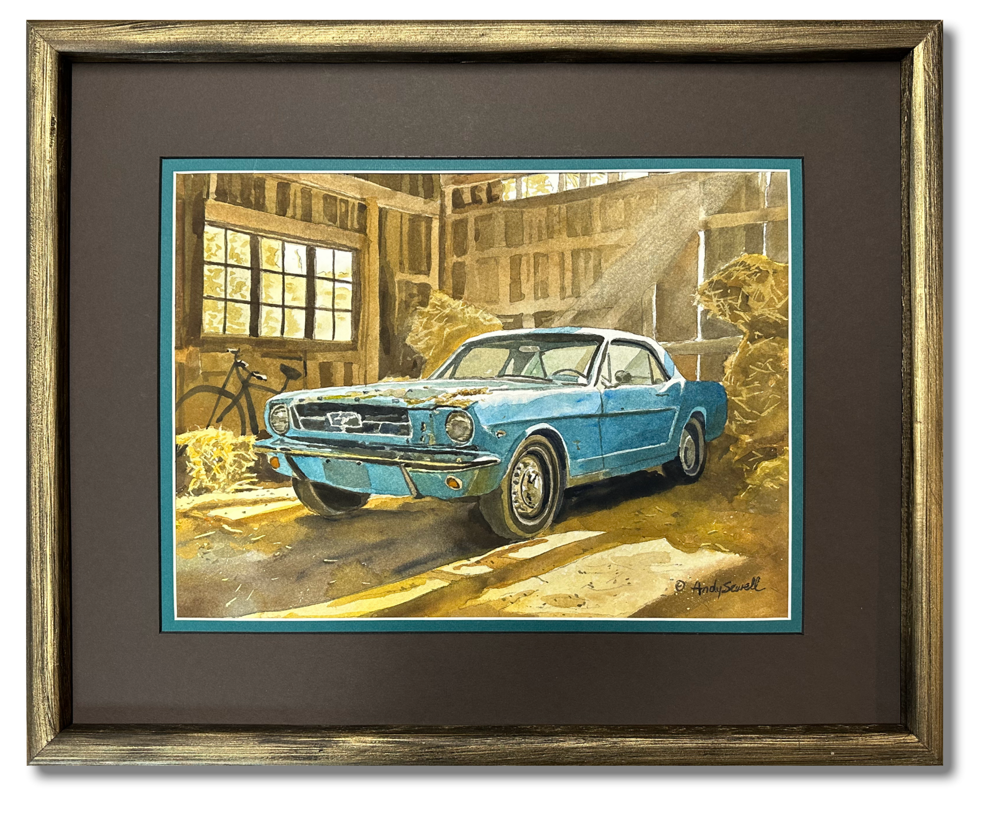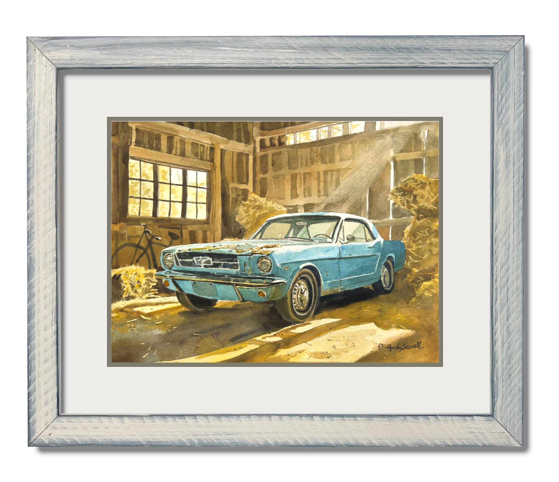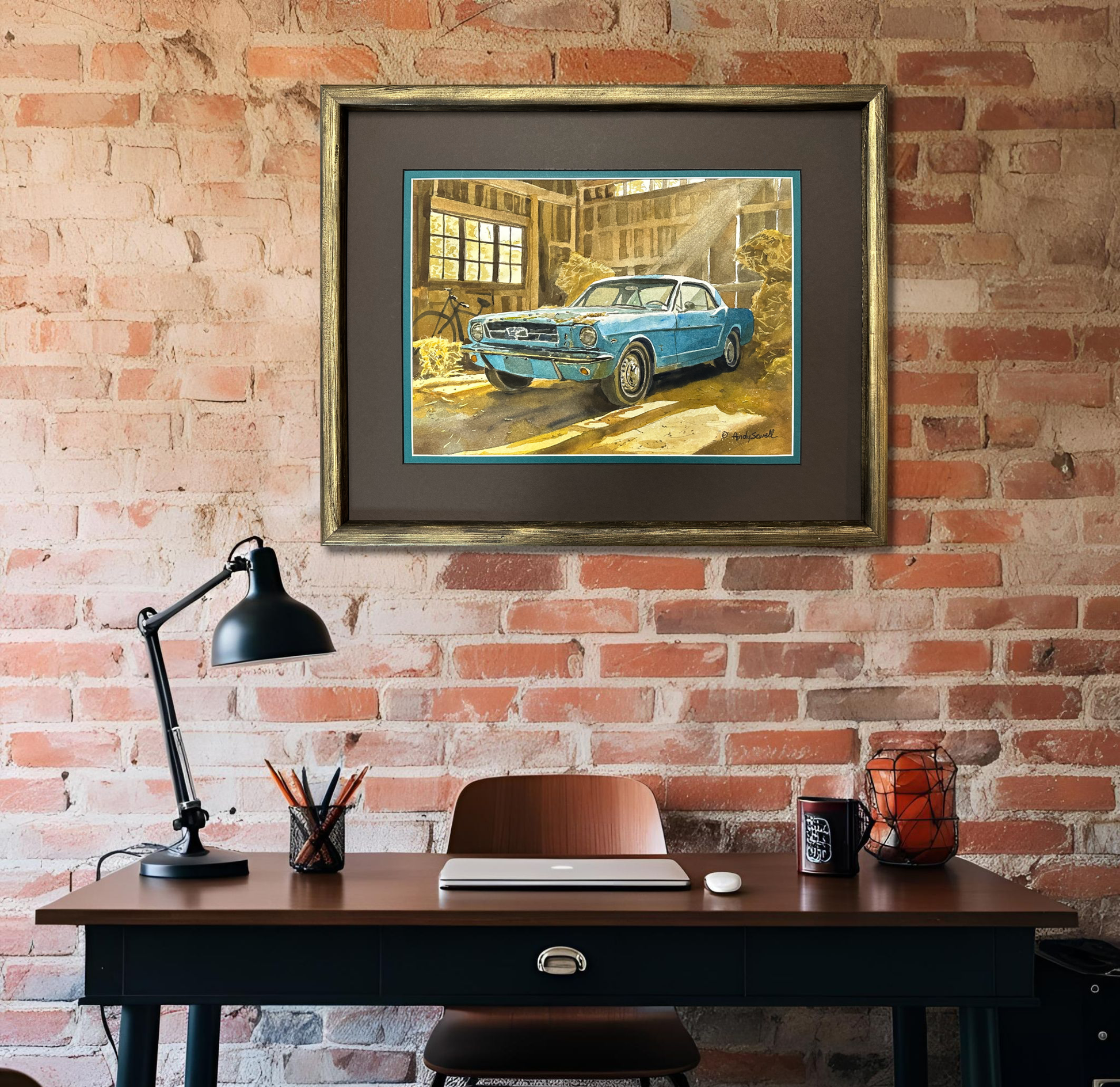 Title: "Baby Blue Barn Find - '65 Ford Mustang" This is a beautiful original watercolor or signed edition print available of an old Ford Mustang in a barn. Email me if you want it framed in one of the other options shown.