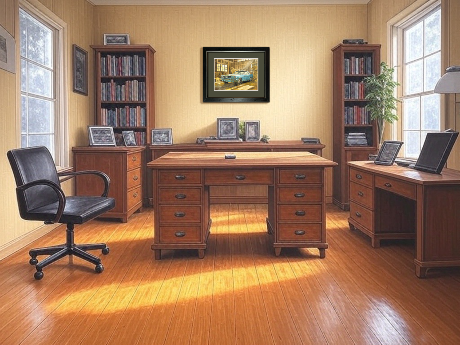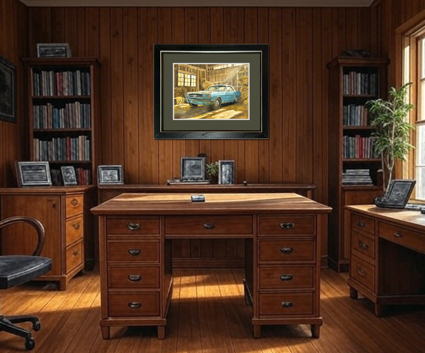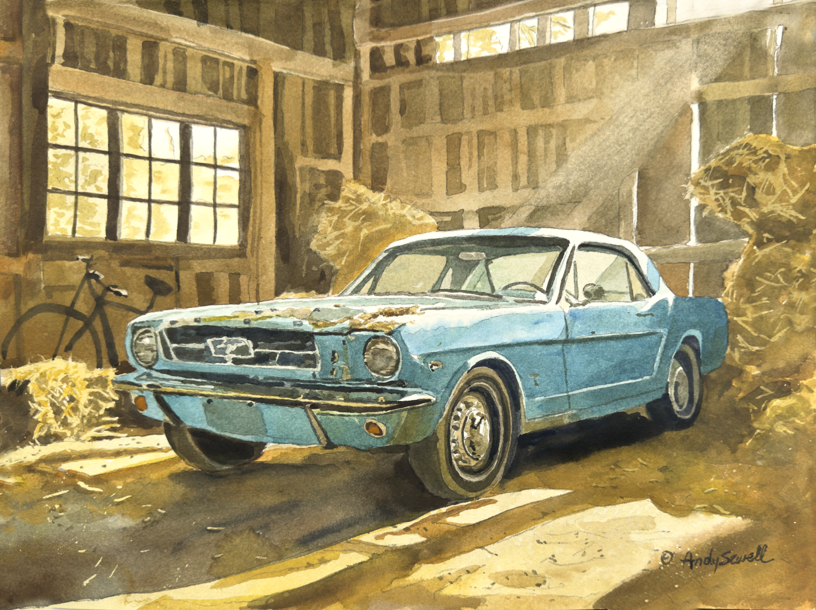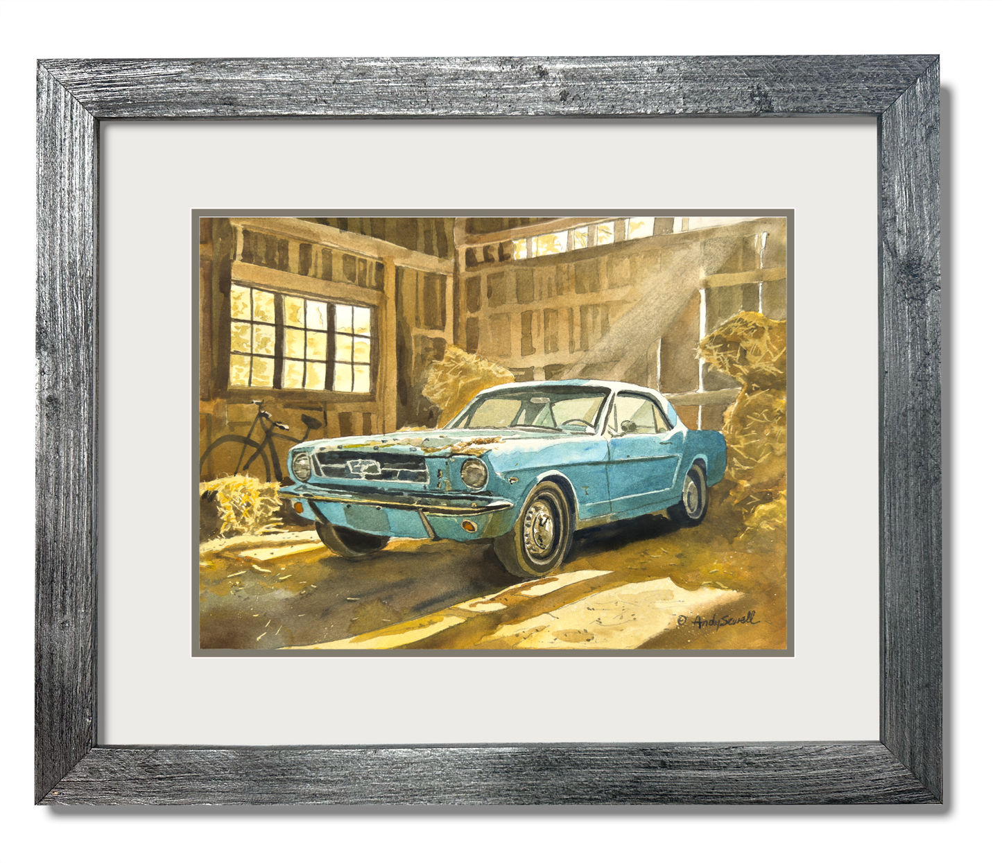 Title: "Baby Blue Barn Find - '65 Ford Mustang" This is a beautiful original watercolor or signed edition print available of an old Ford Mustang in a barn. Email me if you want it framed in one of the other options shown.