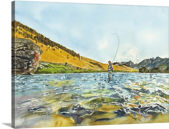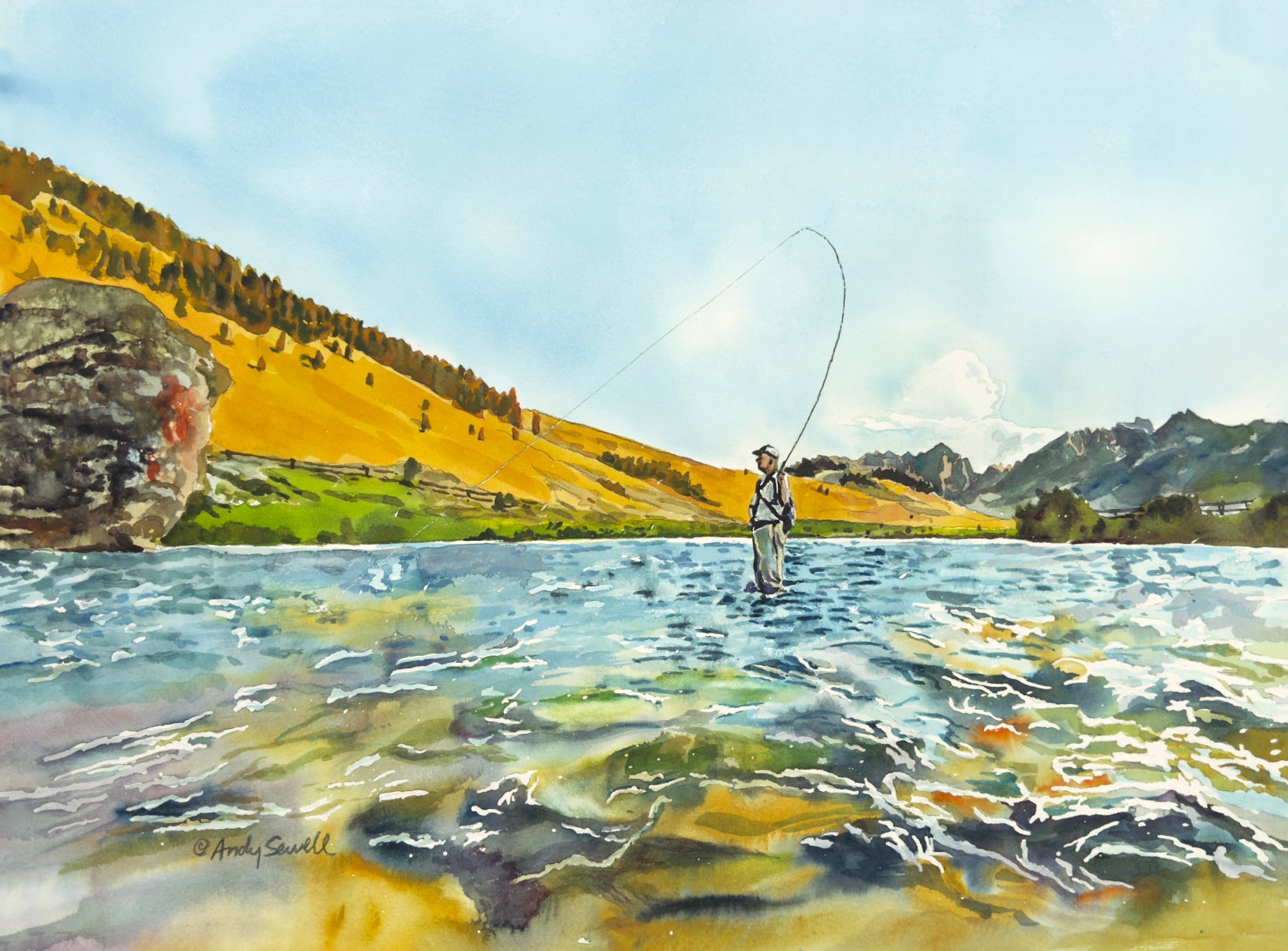 "Bent Rod in the Sawtooths" - an Original watercolor 18x24 or Open Edition Print from a watercolor of a Fly-fisherman on Idaho's upper Salmon River.