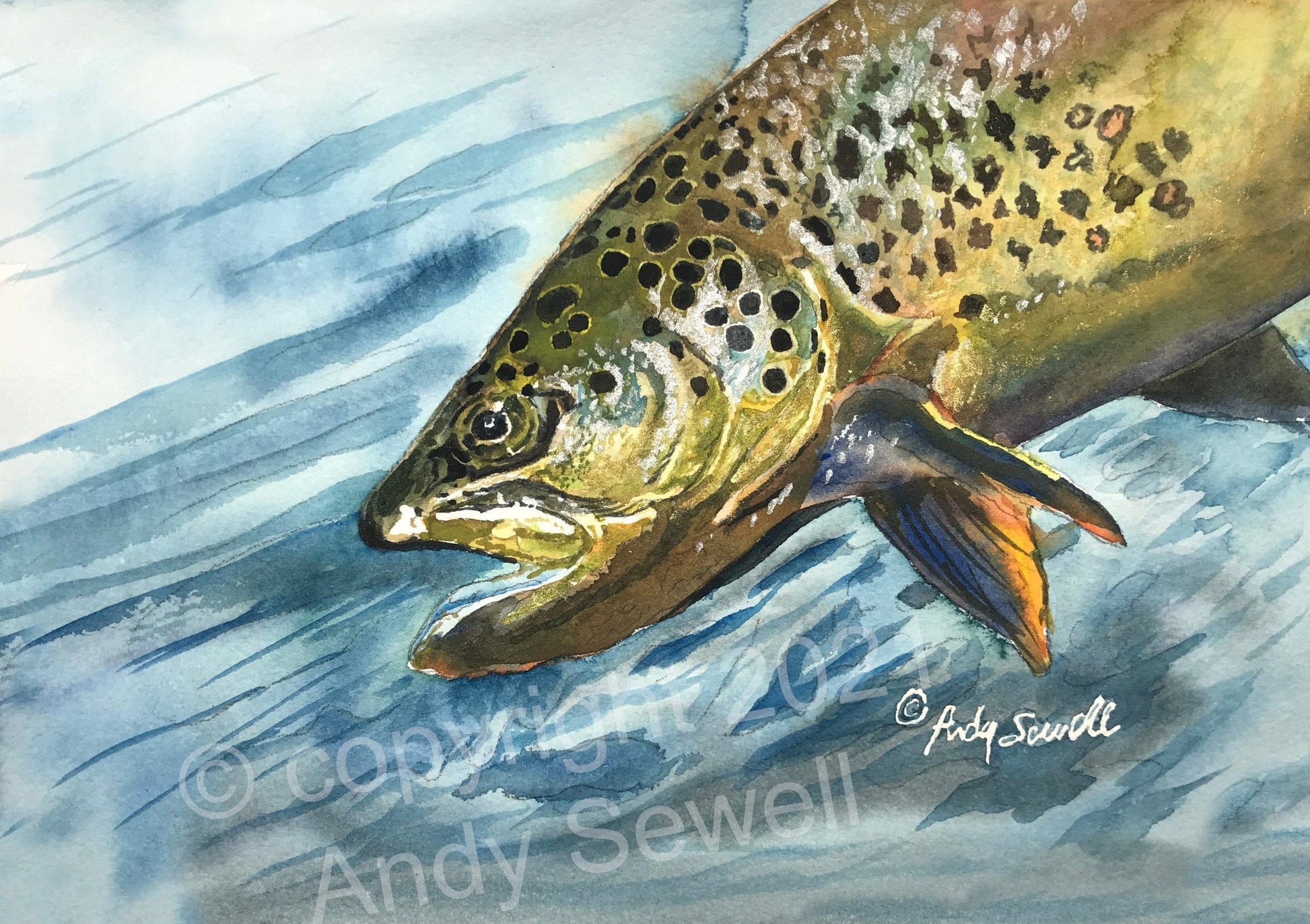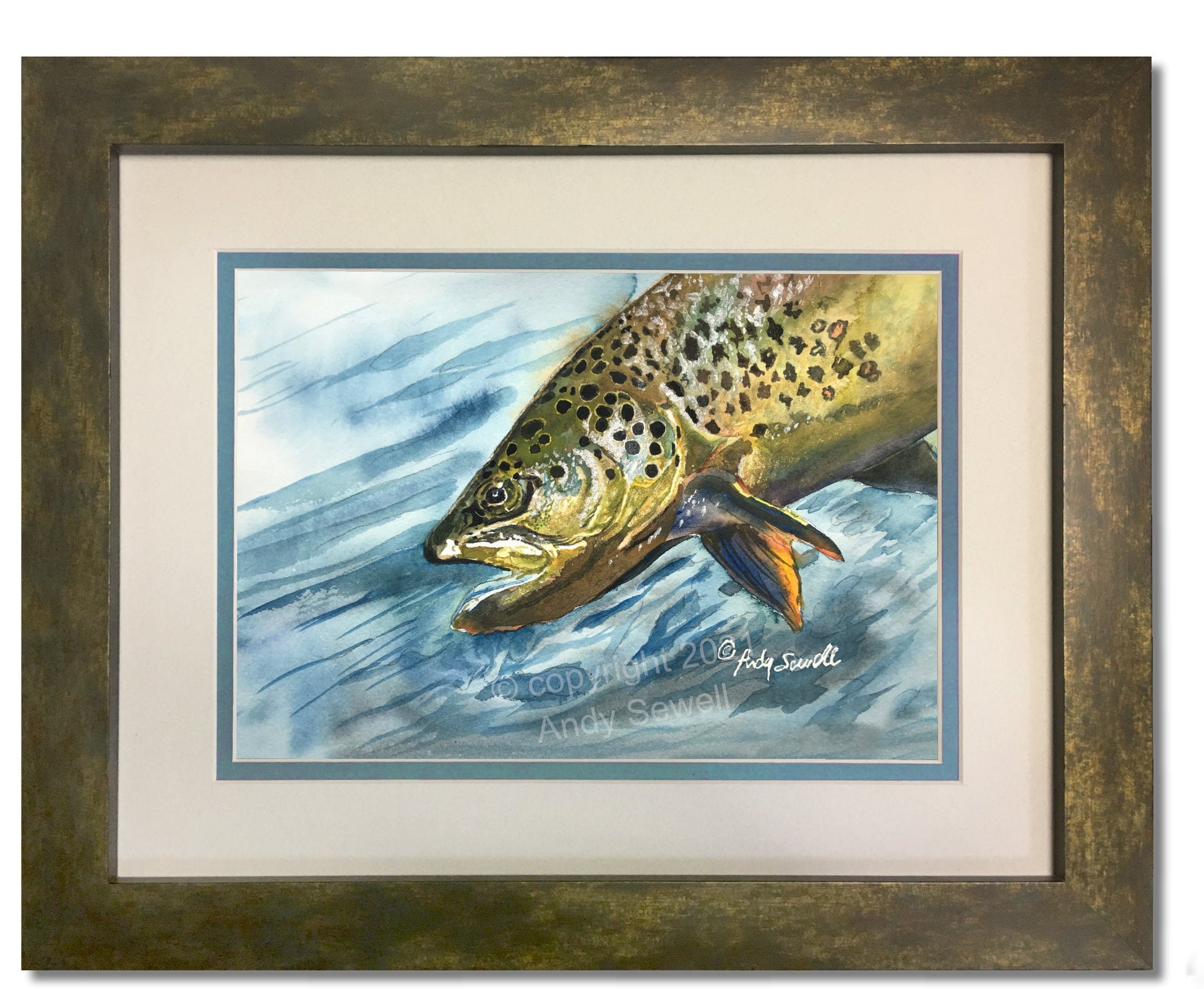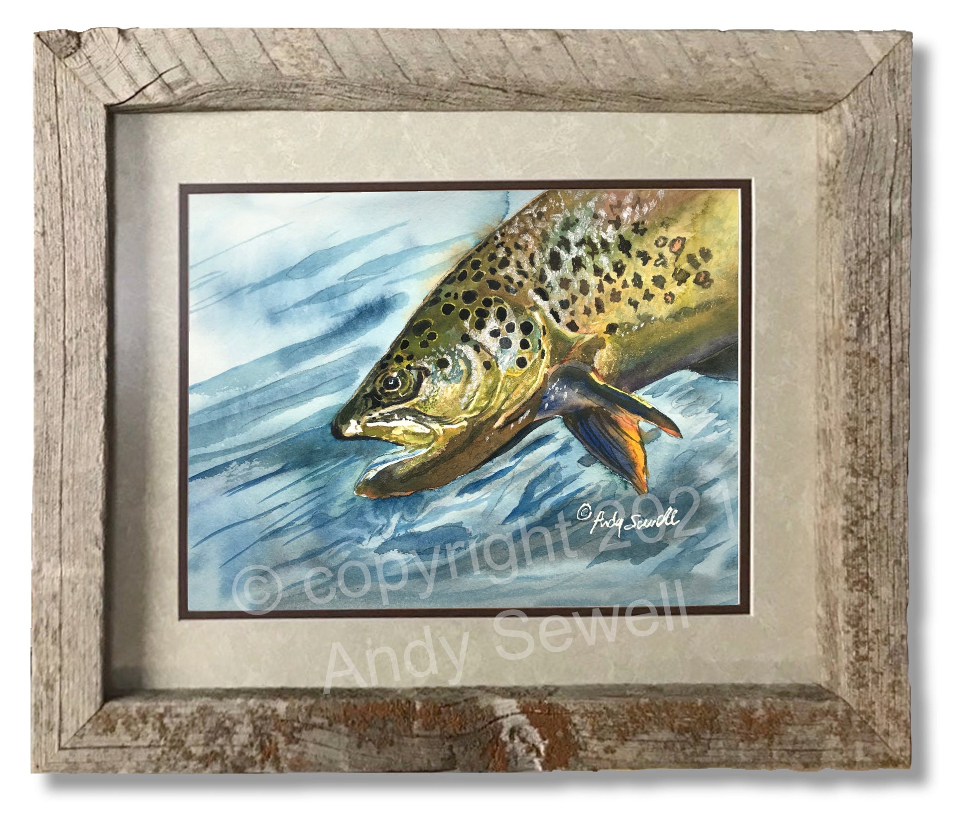 Title: "Brown Trout Sparkle" This is a beautiful original watercolor or signed print available featuring a nice brown trout being released.