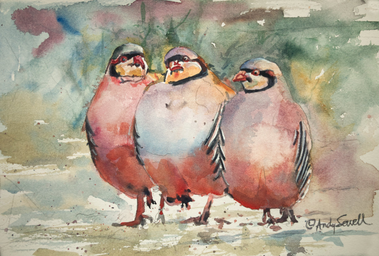 "Chukar Dance" - A watercolor giclee print of 3 chukars strutting in the sun - by Andy Sewell
