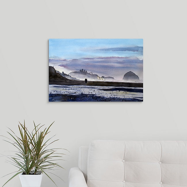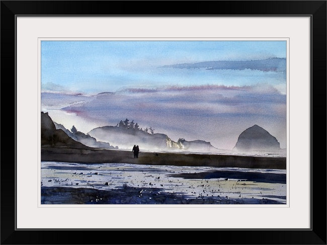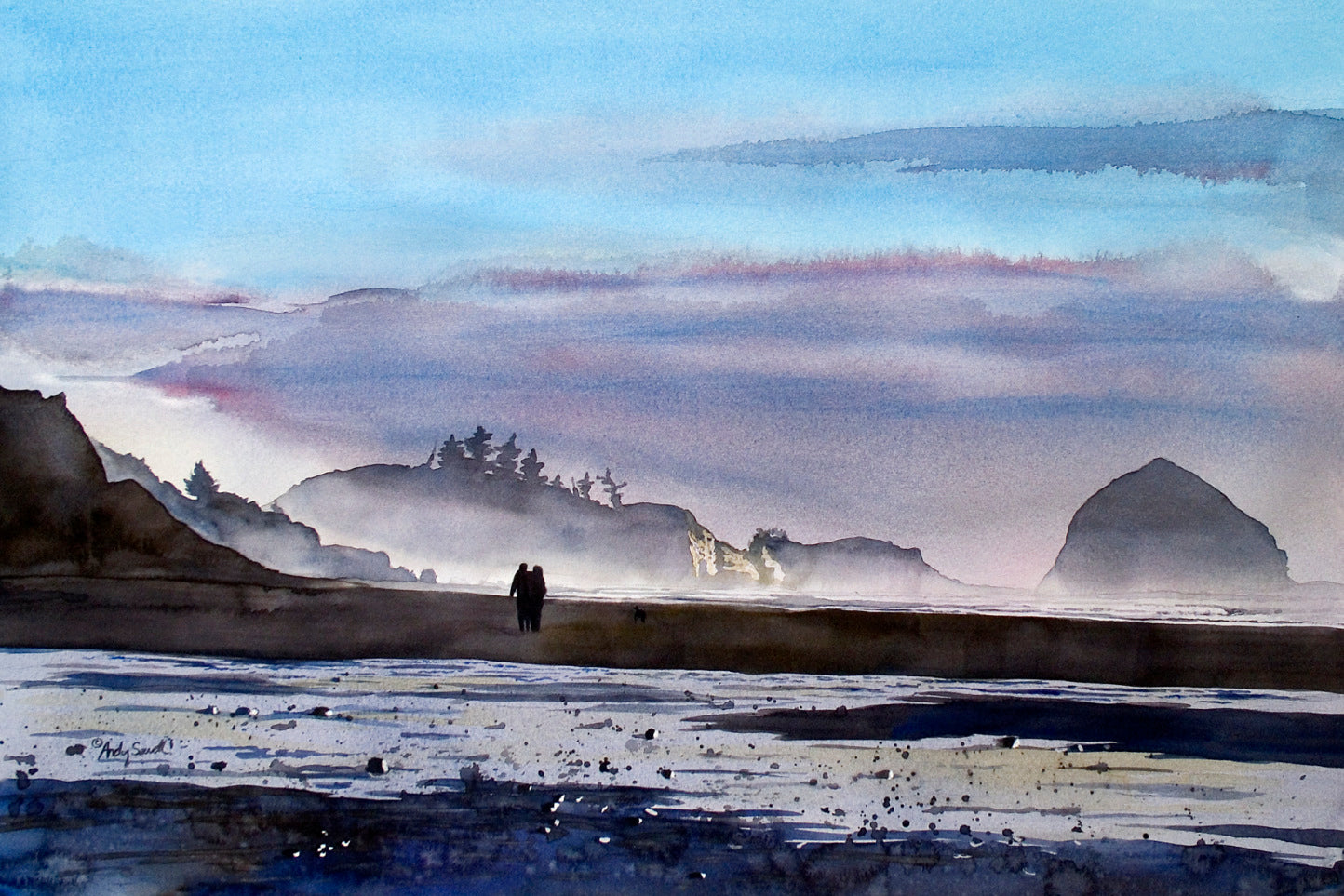 Title: "Coastal Evening Stroll" - 24"x16" Original watercolor painting or ltd. edition Giclee reprod. from evening sunset stroll on the Northwest coast,