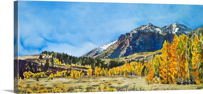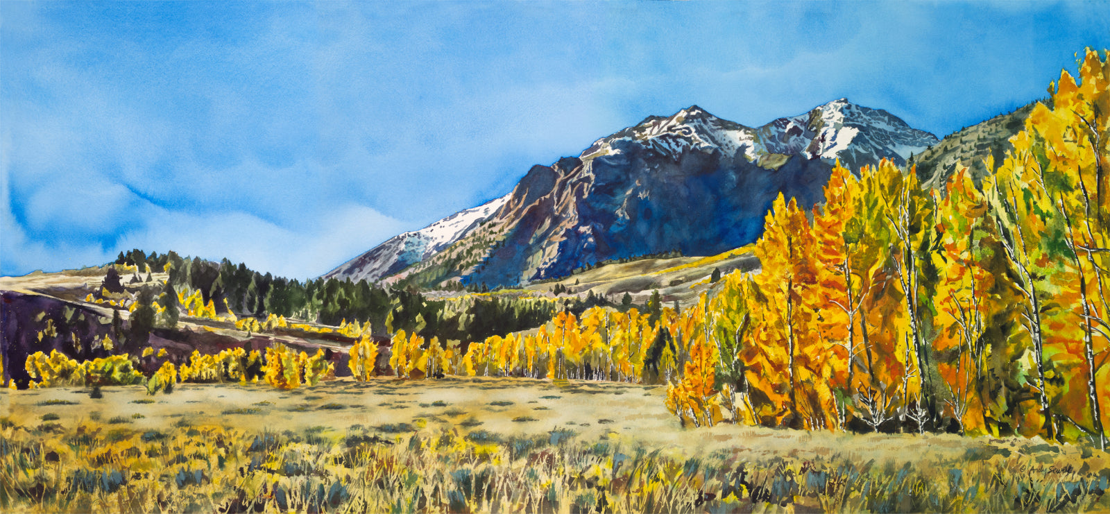 Title: “Gold in the Boulders” This is a beautiful signed edition print from a watercolor of the Boulder mountains just north of Ketchum, Idaho in the fall with aspens turning color. See a close-up video here.