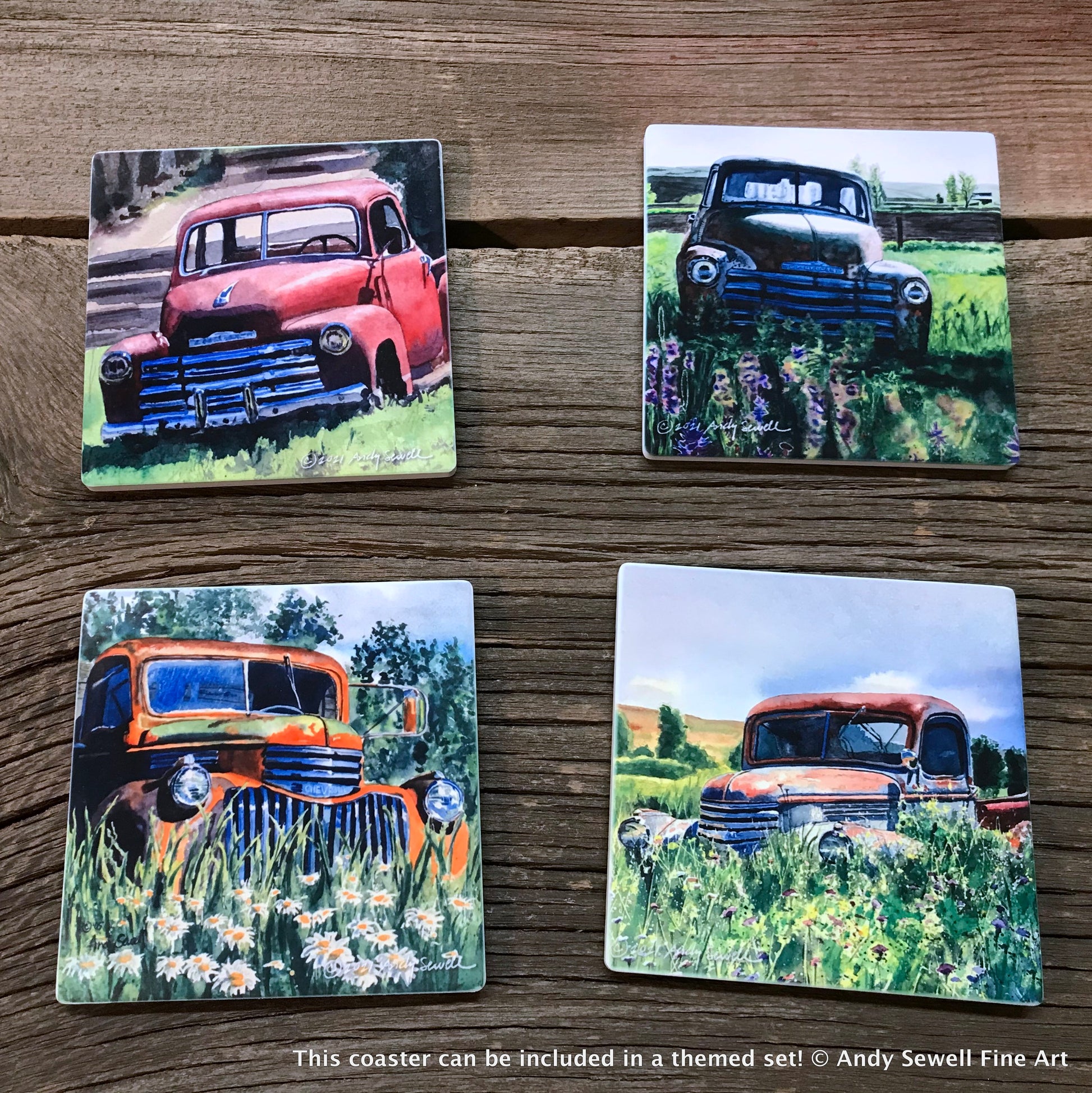 Old Chevy trucks themed in a coaster set of four.