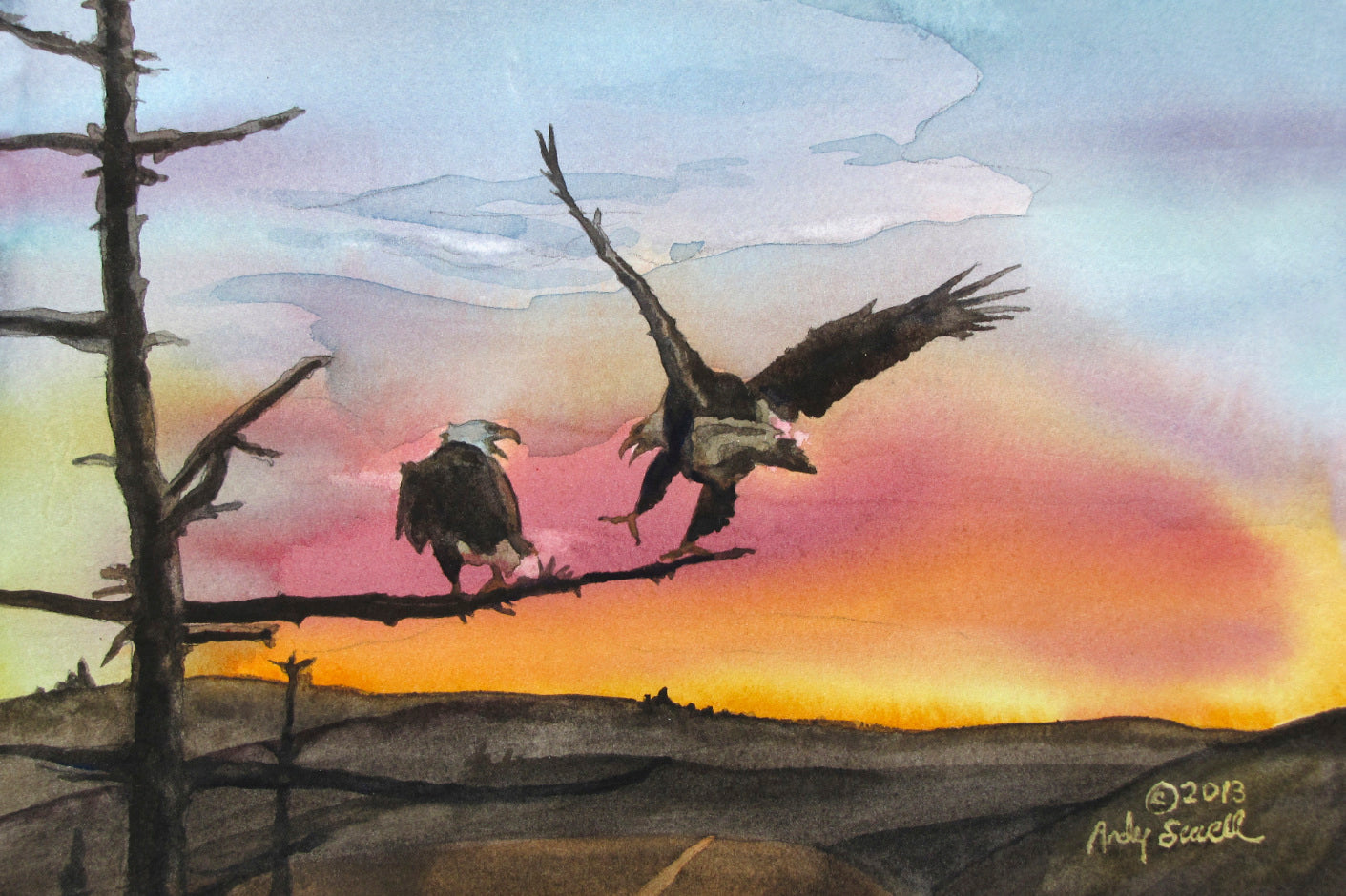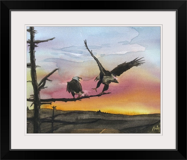 Title: "Eagles Perch" a signed edition print of my Original watercolor featuring eagles landing on a branch in the sunset.