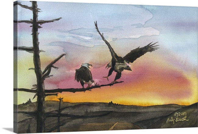 "Eagles Perch" - Original watercolor or prints of Eagles landing in the sunset