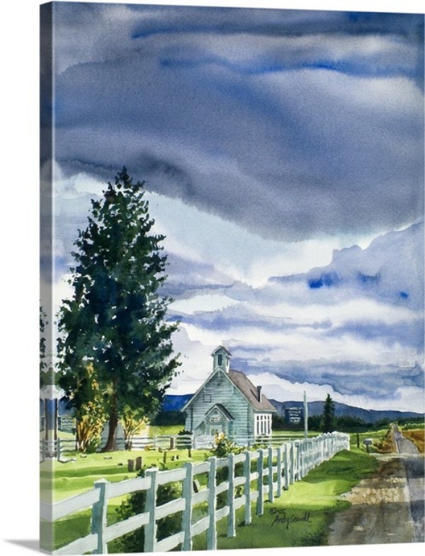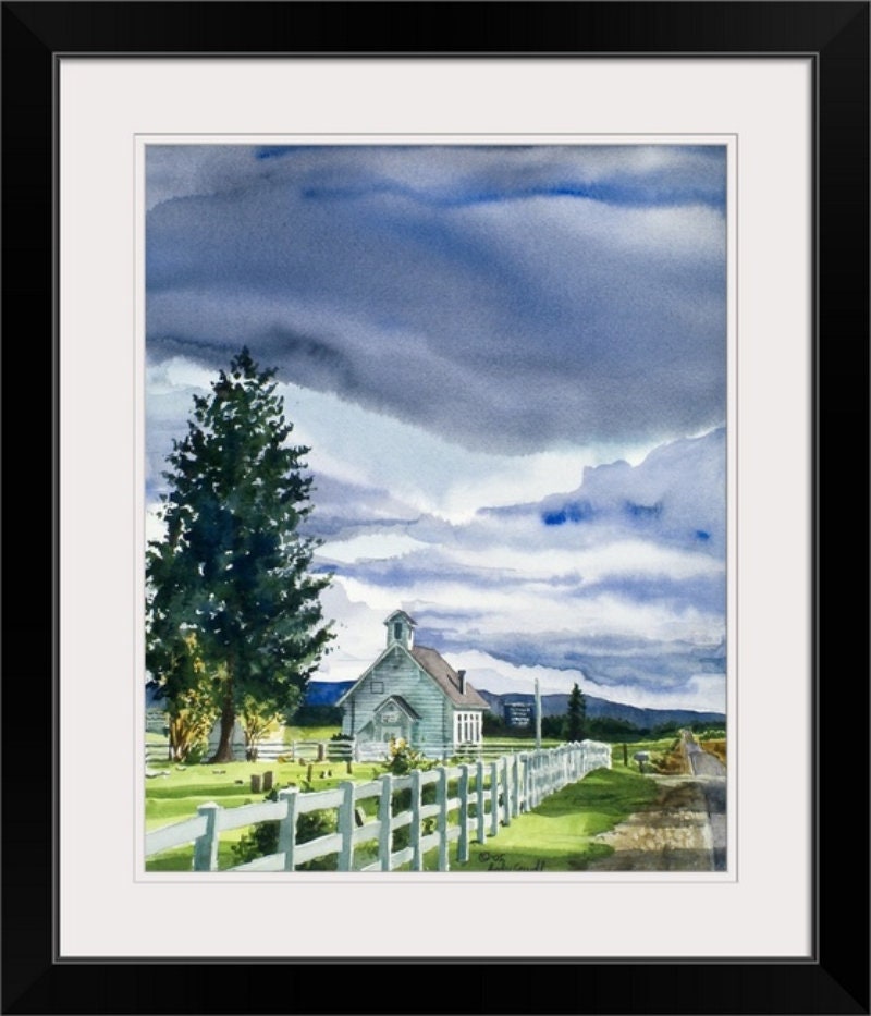 This is a beautiful s/n ltd. edition print of my original watercolor featuring a the Finnish Church in McCall, Idaho looking down farm to market road.