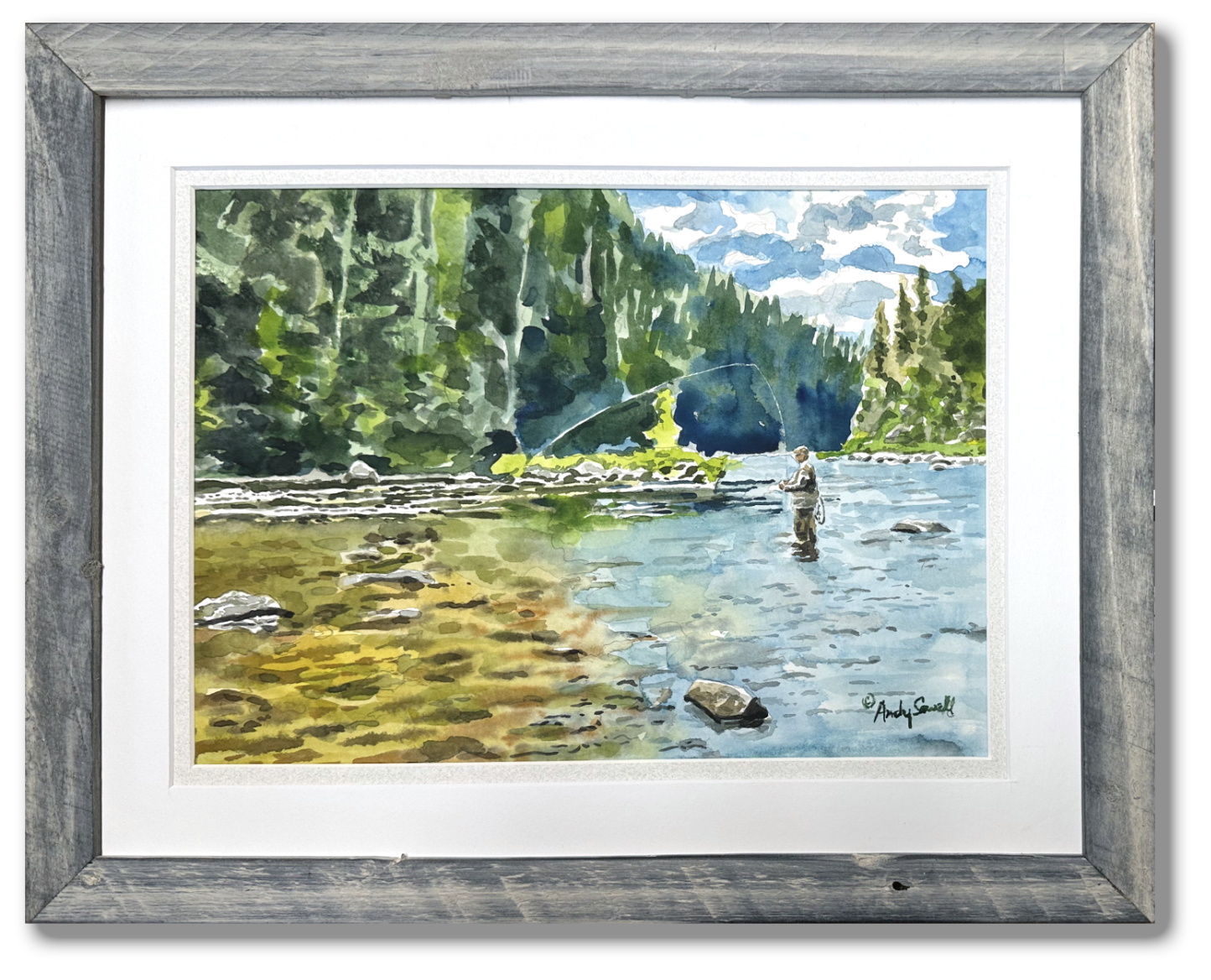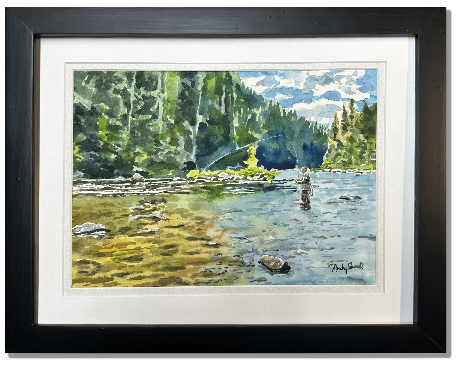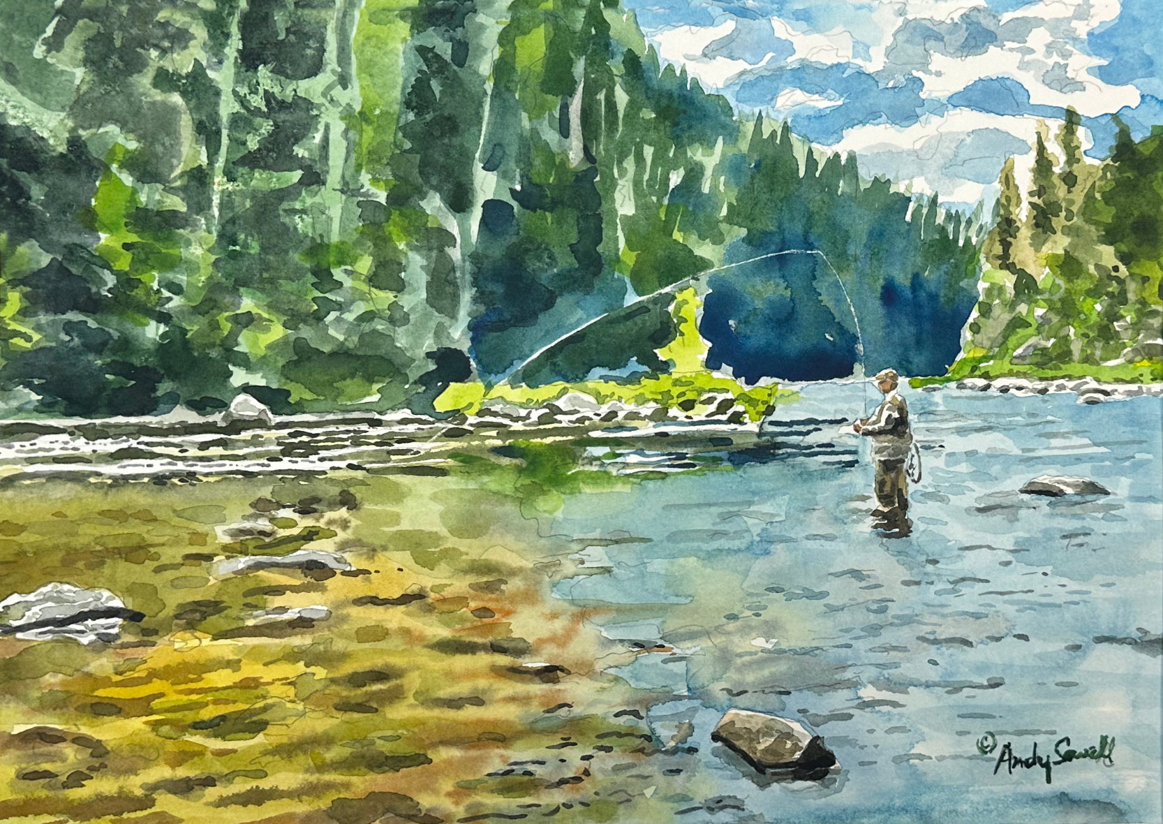 Title: "Fishing into the clear" This is a beautiful print from my original watercolor featuring me fishing Idaho's lochsa River.