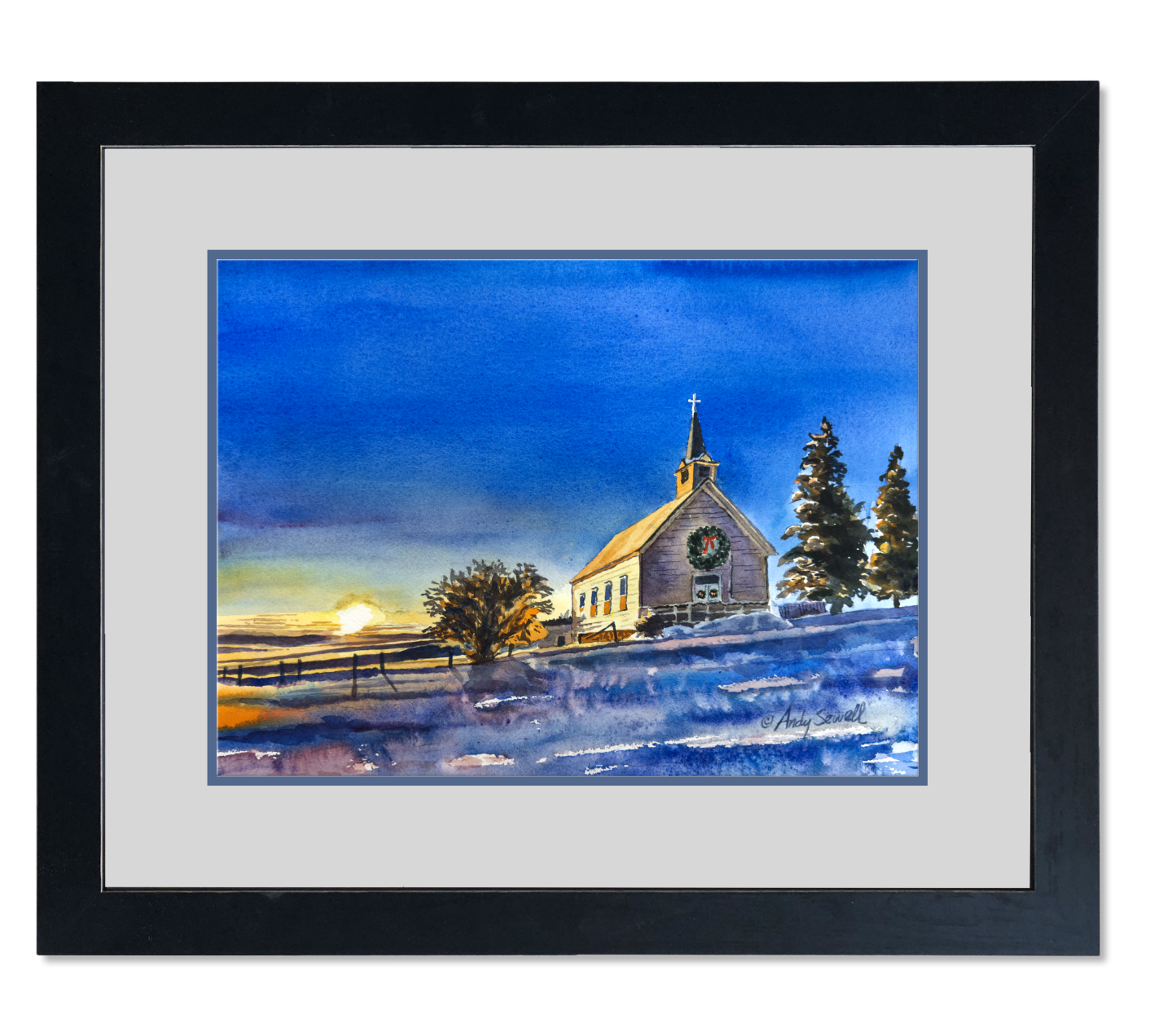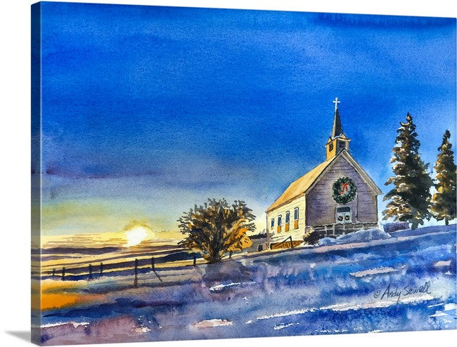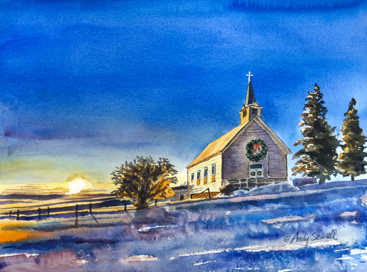 Title: "Freeze Church Christmas" This is a beautiful original watercolor or signed edition print of my Original watercolor featuring the old Freeze church in the winter sunset. Click here to order christmas notecards.