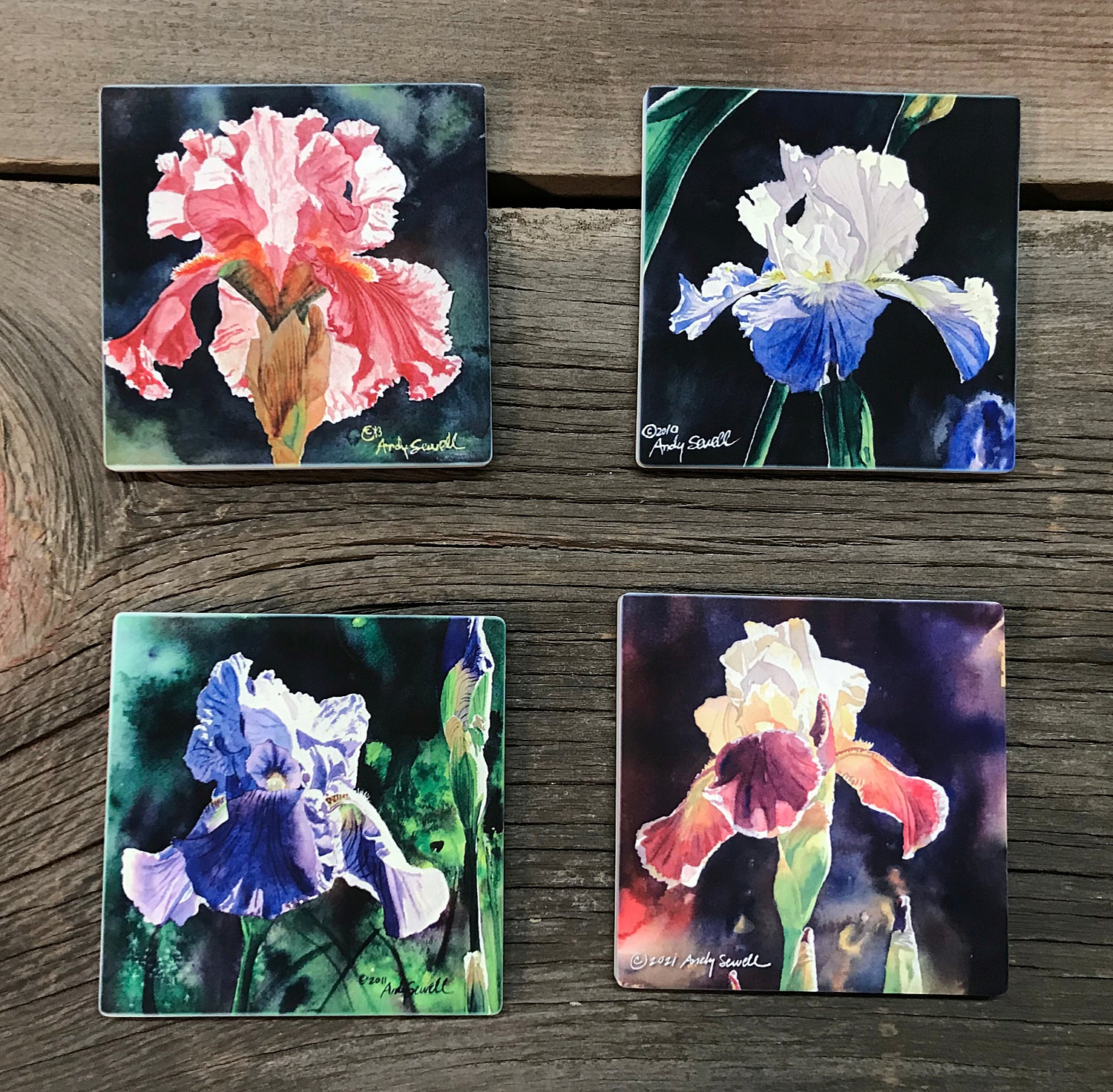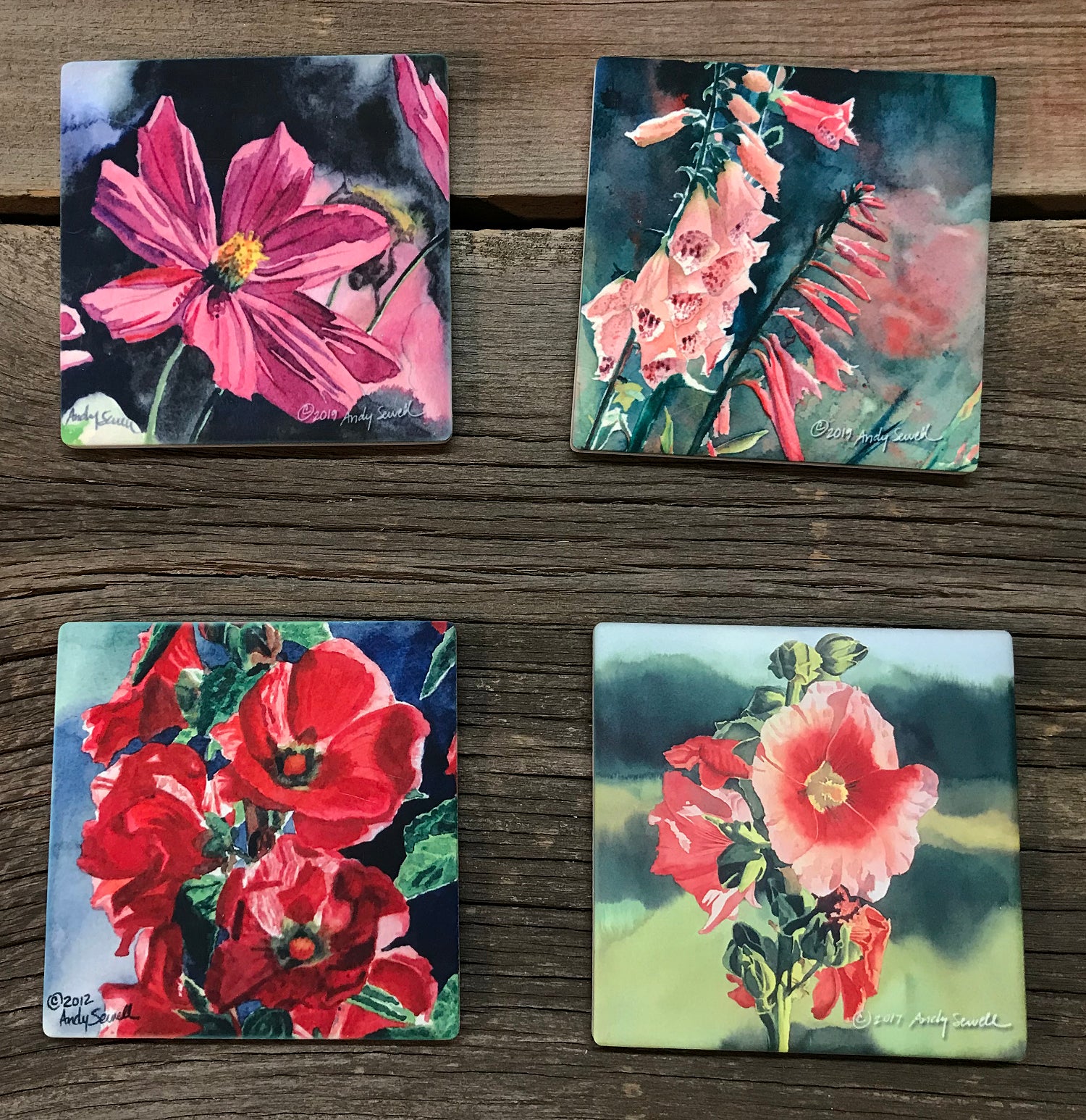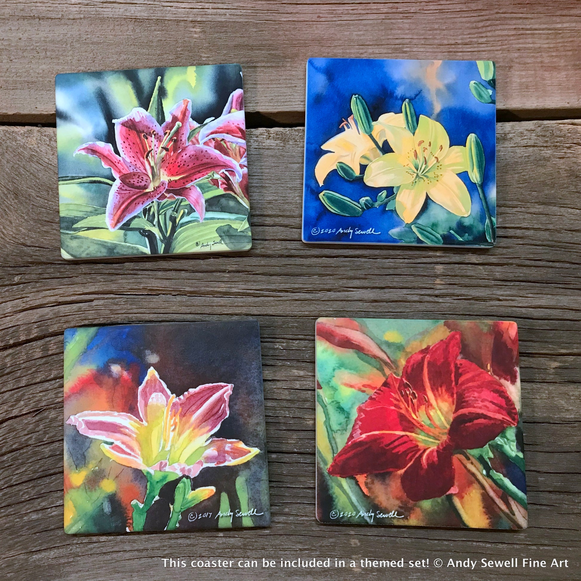 The fine art ceramic coaster are created by the artist Andy from his original paintings. They are a very scratch resistant matte surface with cork backing. The coasters have sharp details and vivid color. They are 3 7/8" square. Many of the images come in sets. You can search for your favorite subjects. Mix and match any combination of coasters to create your own matching or custom set.