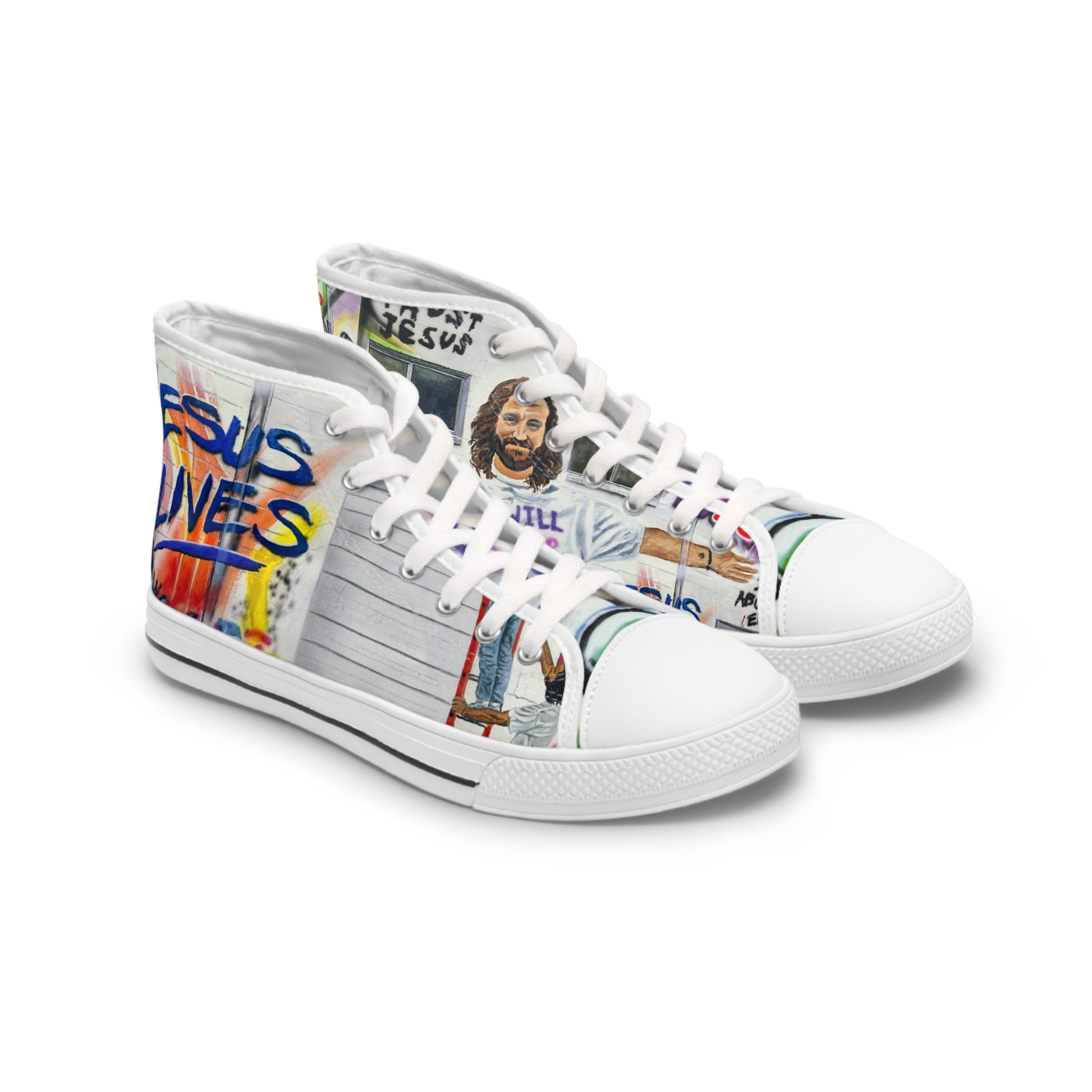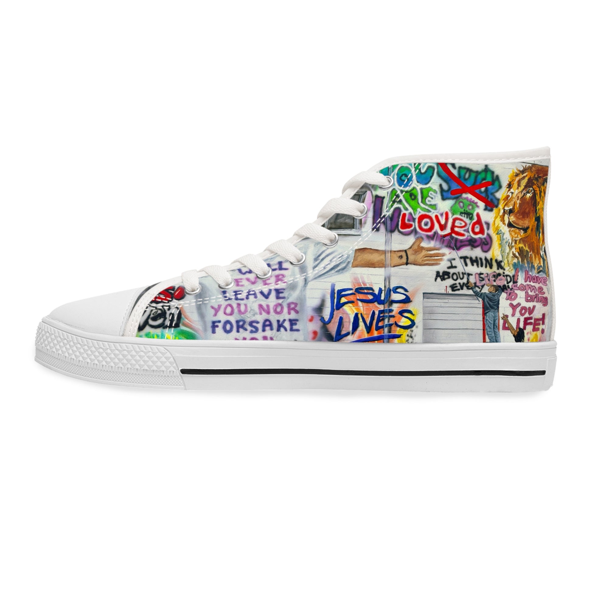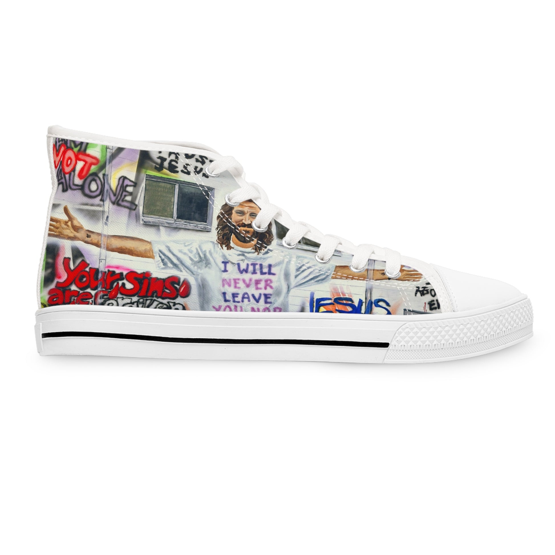 Walk around with Andy's artwork featuring Jesus changing lies to truth, 'Painting Graffiti with Jesus.' Help bring truth to a world that believes too many lies. These sneakers give off a unique and artistic vibe, perfect for those looking to make a statement with their footwear. Ideal for those who appreciate religious art and want to express their faith through their fashion choices. Great for Christmas, Easter, or any religious holiday.