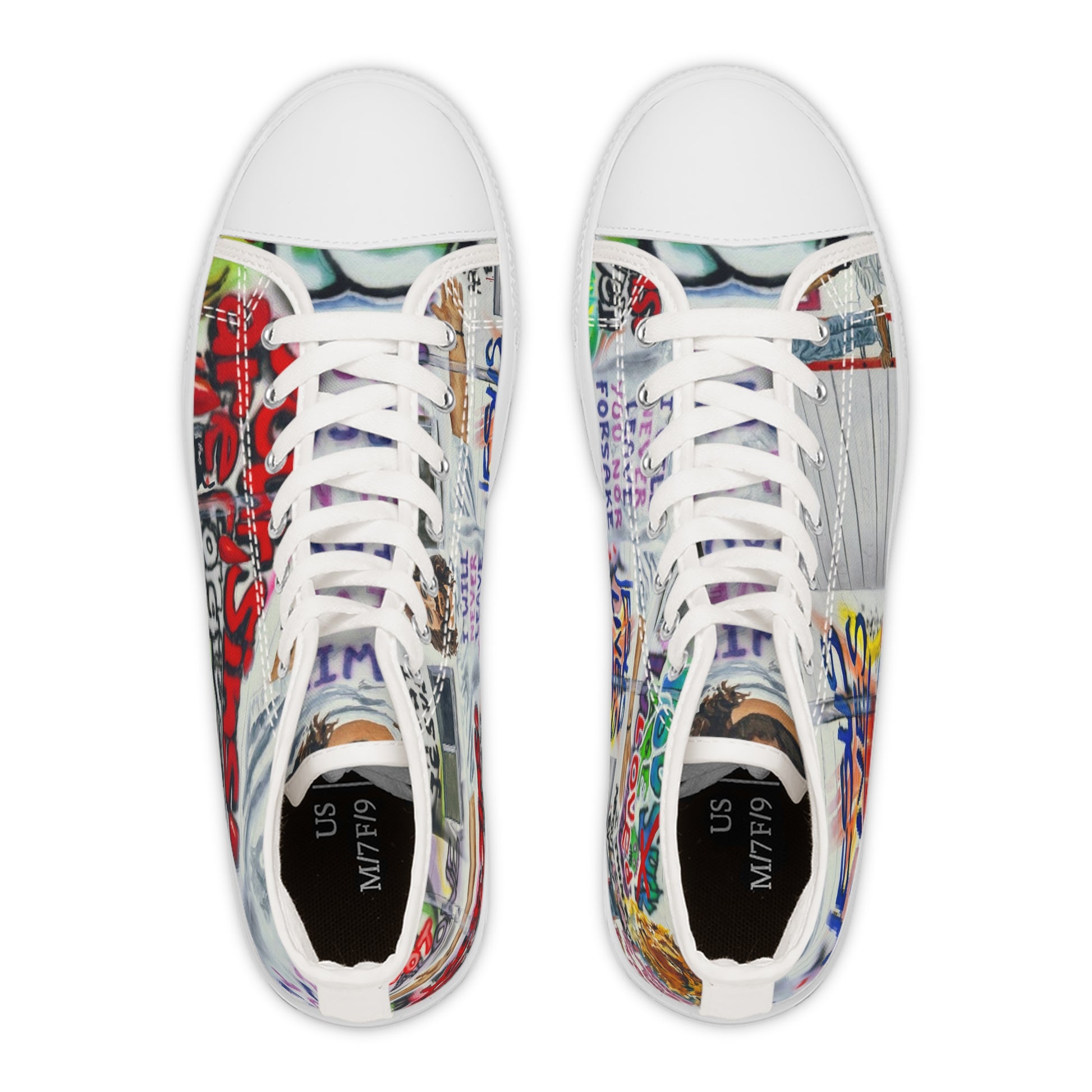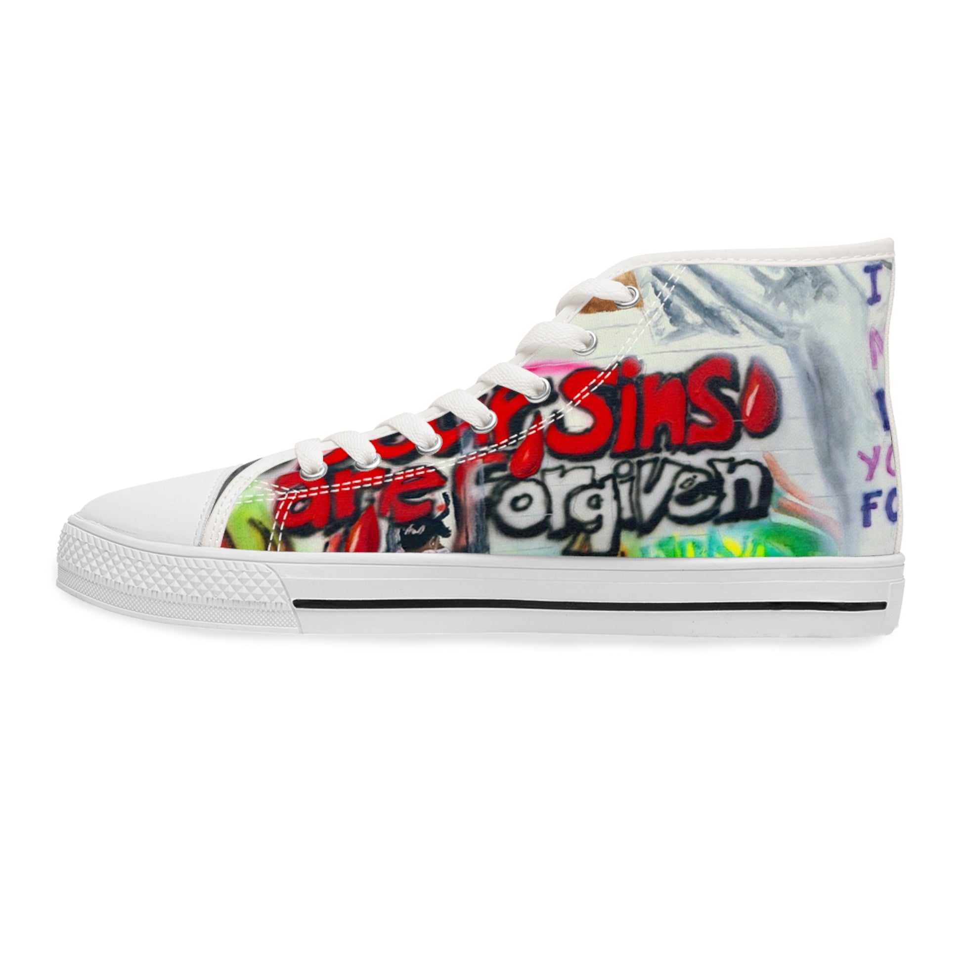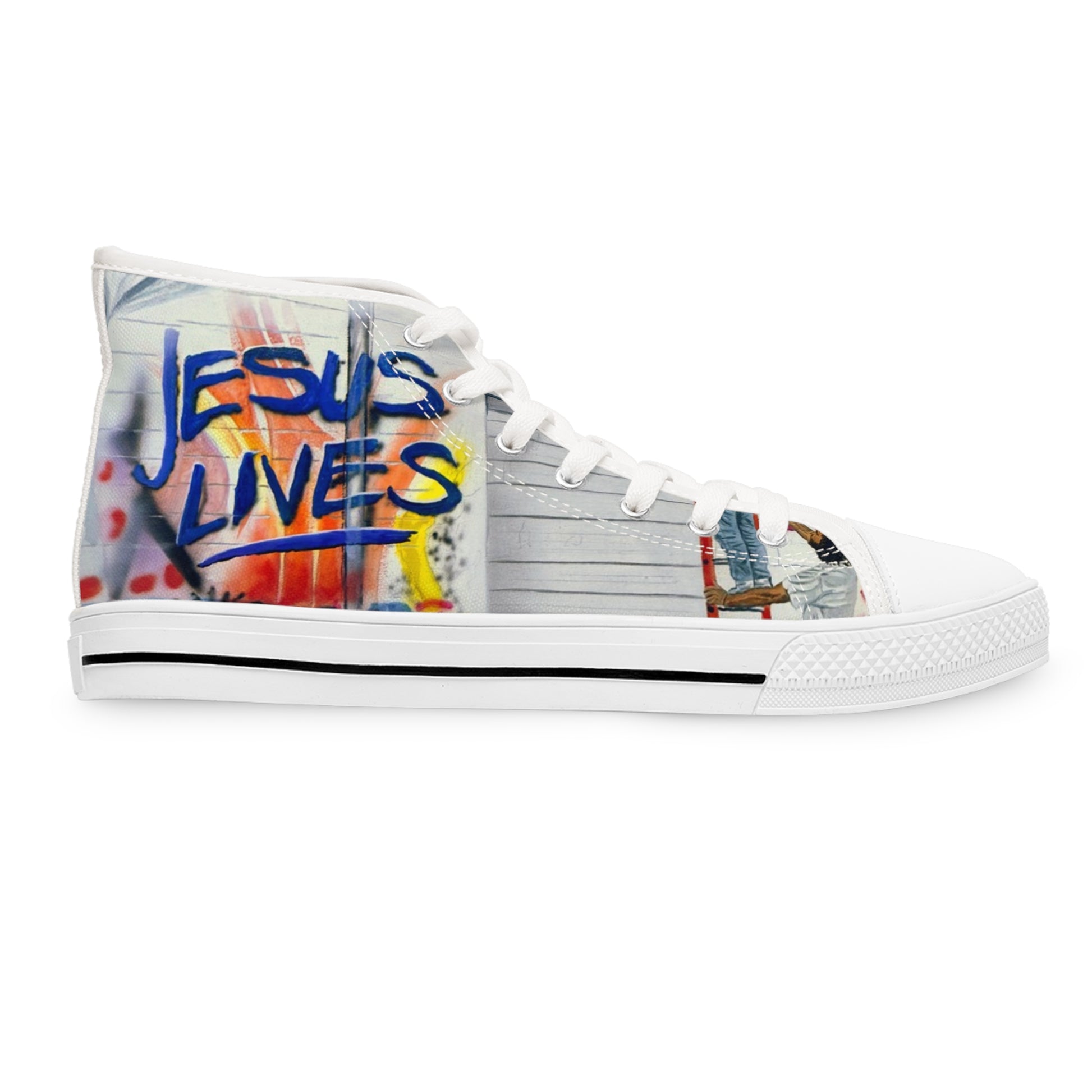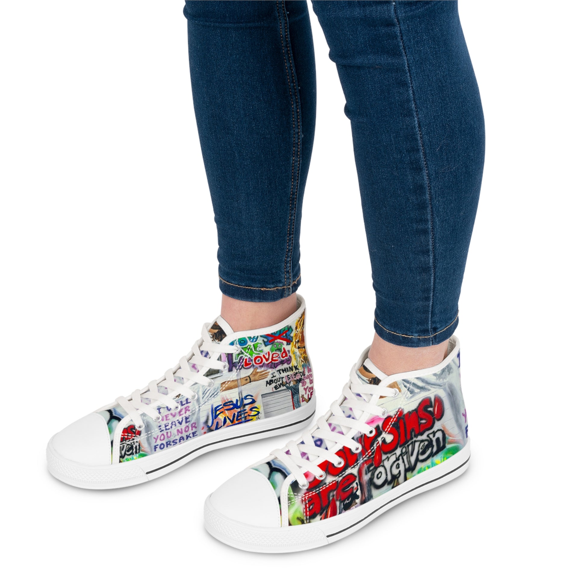 Walk around with Andy's artwork featuring Jesus changing lies to truth, 'Painting Graffiti with Jesus.' Help bring truth to a world that believes too many lies. These sneakers give off a unique and artistic vibe, perfect for those looking to make a statement with their footwear. Ideal for those who appreciate religious art and want to express their faith through their fashion choices. Great for Christmas, Easter, or any religious holiday.