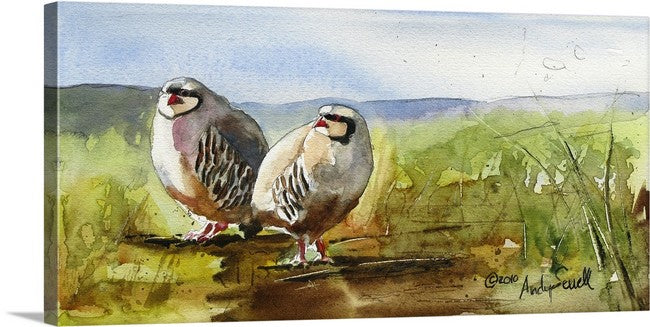 "Huddling up" 20x10" -A signed Giclee art print from an Original watercolor of 2 chukars in a huddle