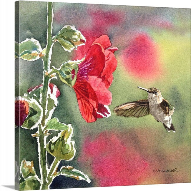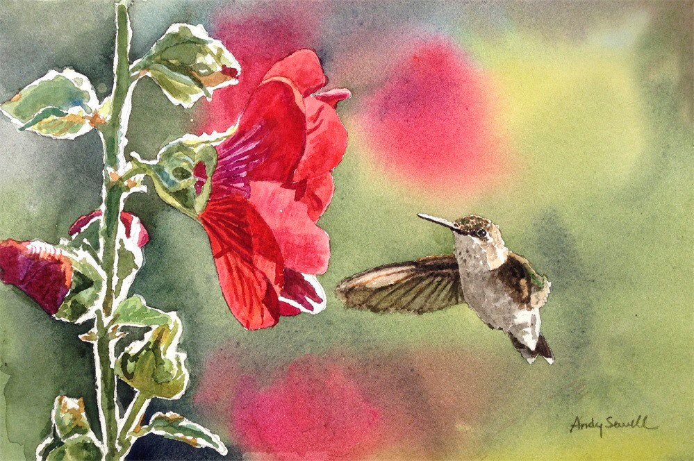 Hummingbird at Hollyhock - 7" x 11" Archival Watercolor Print S/N Ltd. Ed. by Andy Sewell