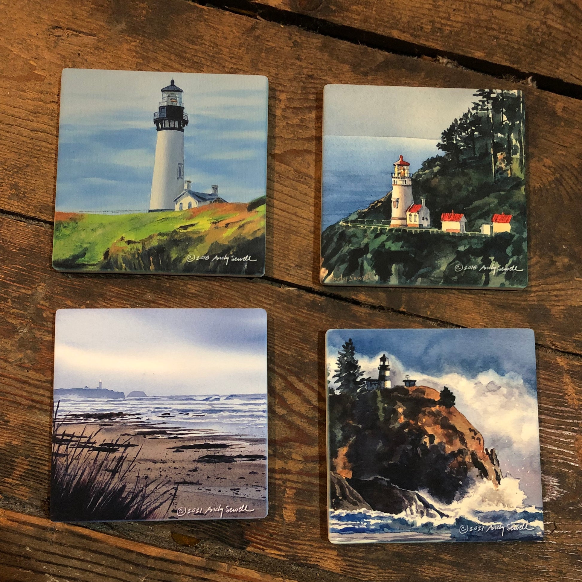 This is a beautiful set of coasters showing off the beauty of the ocean and lighthouses.