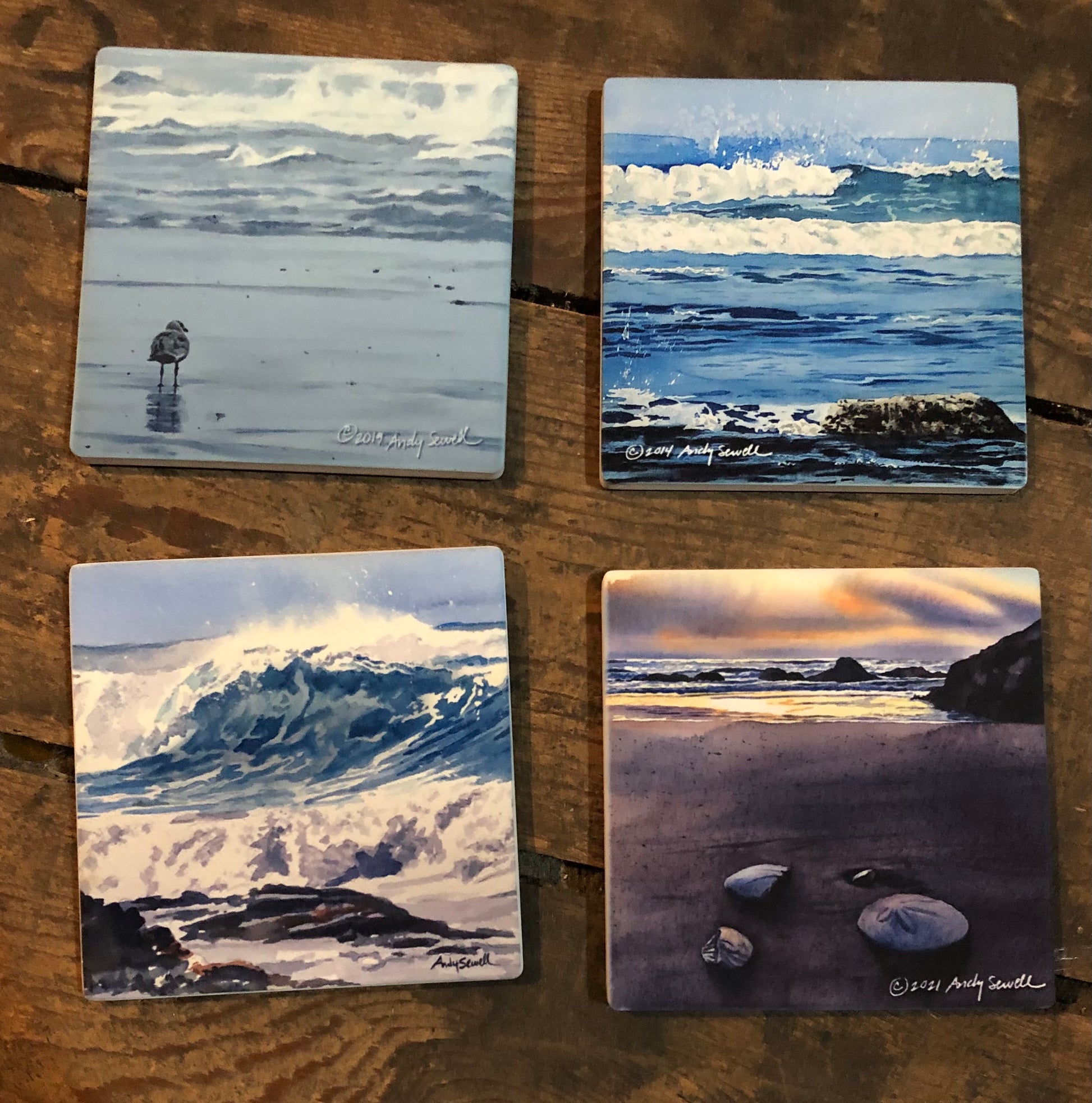 The fine art ceramic coaster are created by the artist Andy from his original paintings. They are a very scratch resistant matte surface with cork backing. The coasters have sharp details and vivid color. They are 3 7/8" square. Many of the images come in sets. You can search for your favorite subjects. Mix and match any combination of coasters to create your own matching or custom set.