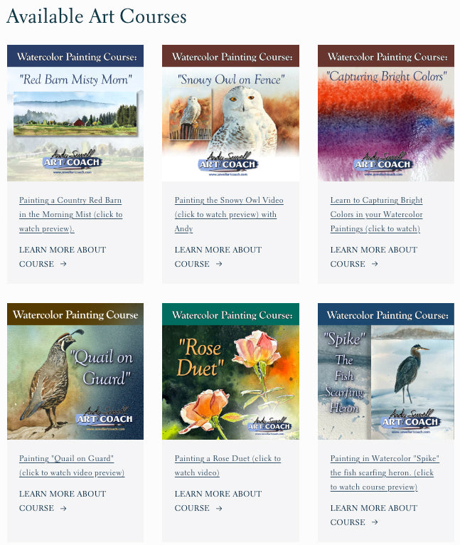 I now have online watercolor courses available to help you learn to paint watercolors. I have several course now available. Once purchased you can watch it as often as you want.