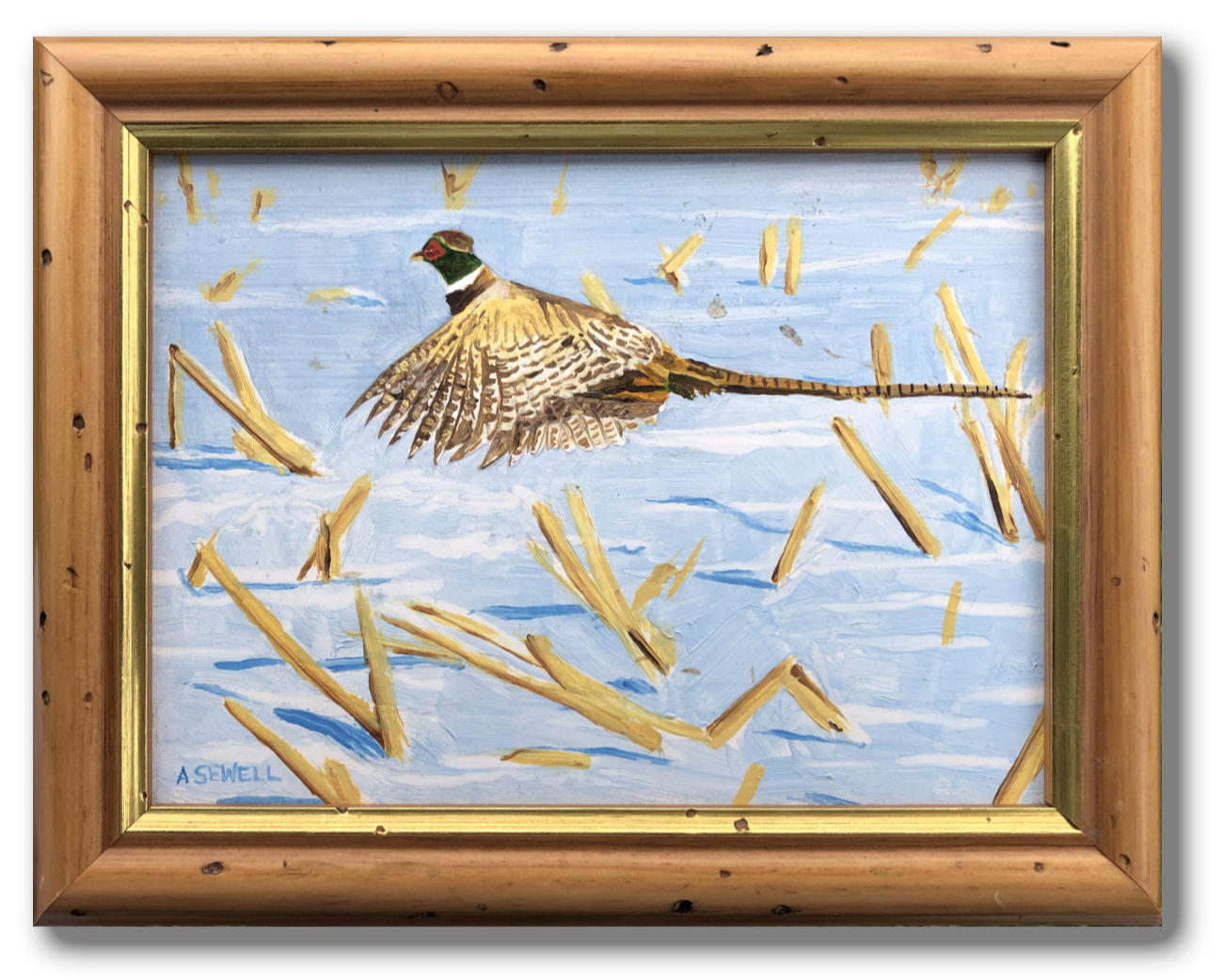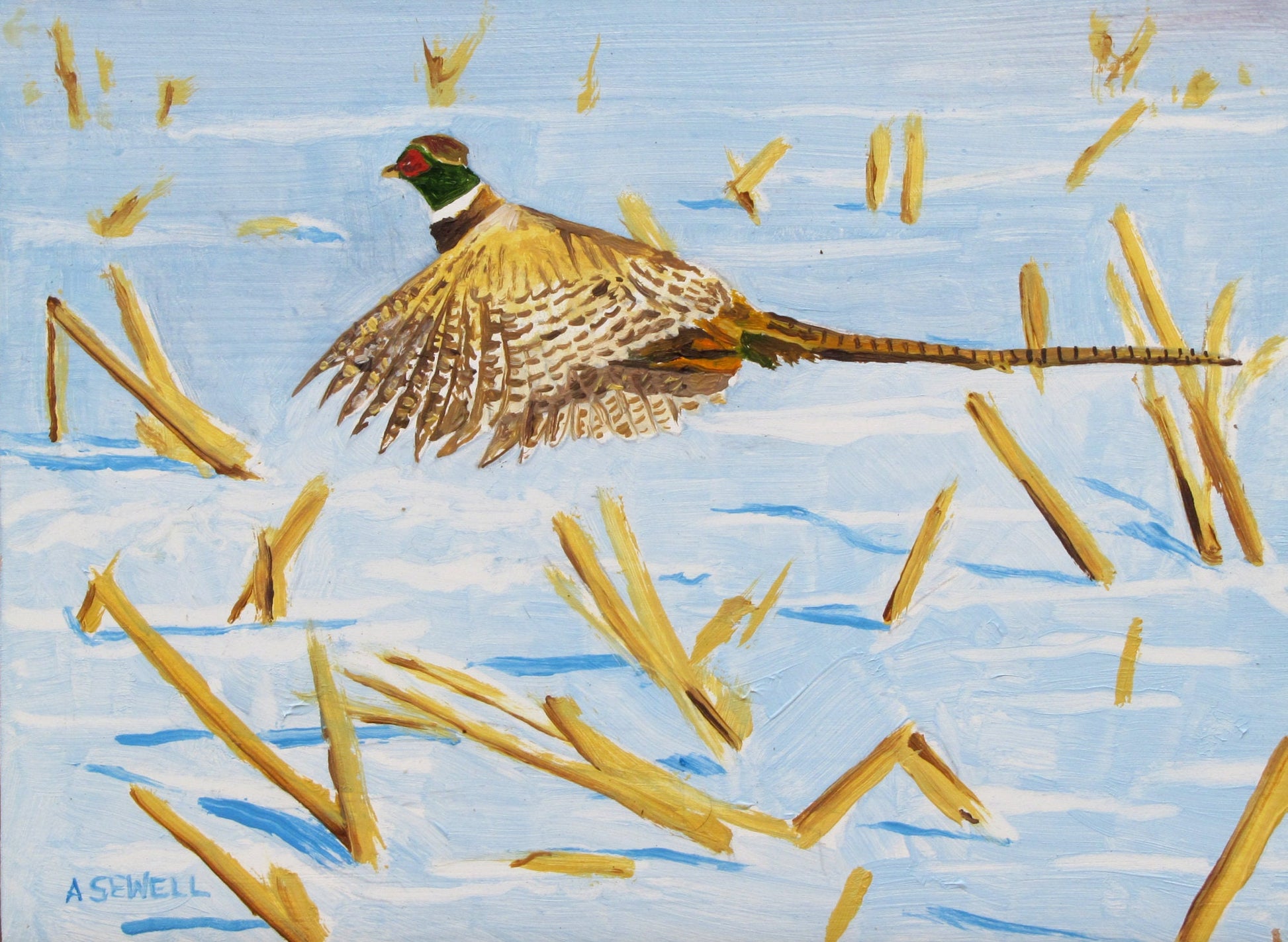 Title: "Winter Pheasant" This is from an Original oil painting featuring a pheasant flying in the winter. Prints available.