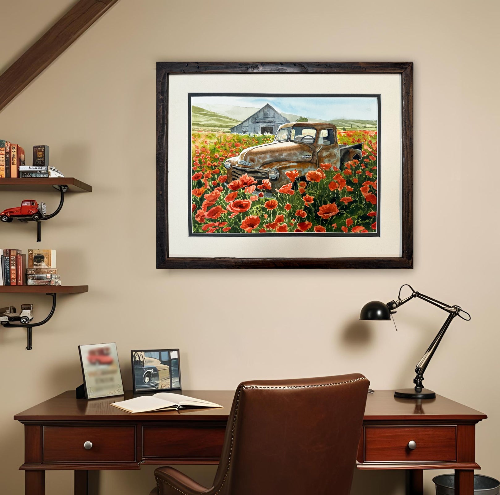 Title: "Poppies & Patina, Chevy's last ride" This is a beautiful original watercolor of signed edition print of my original watercolor featuring a classic old antique 5 window chevy in a field of poppies