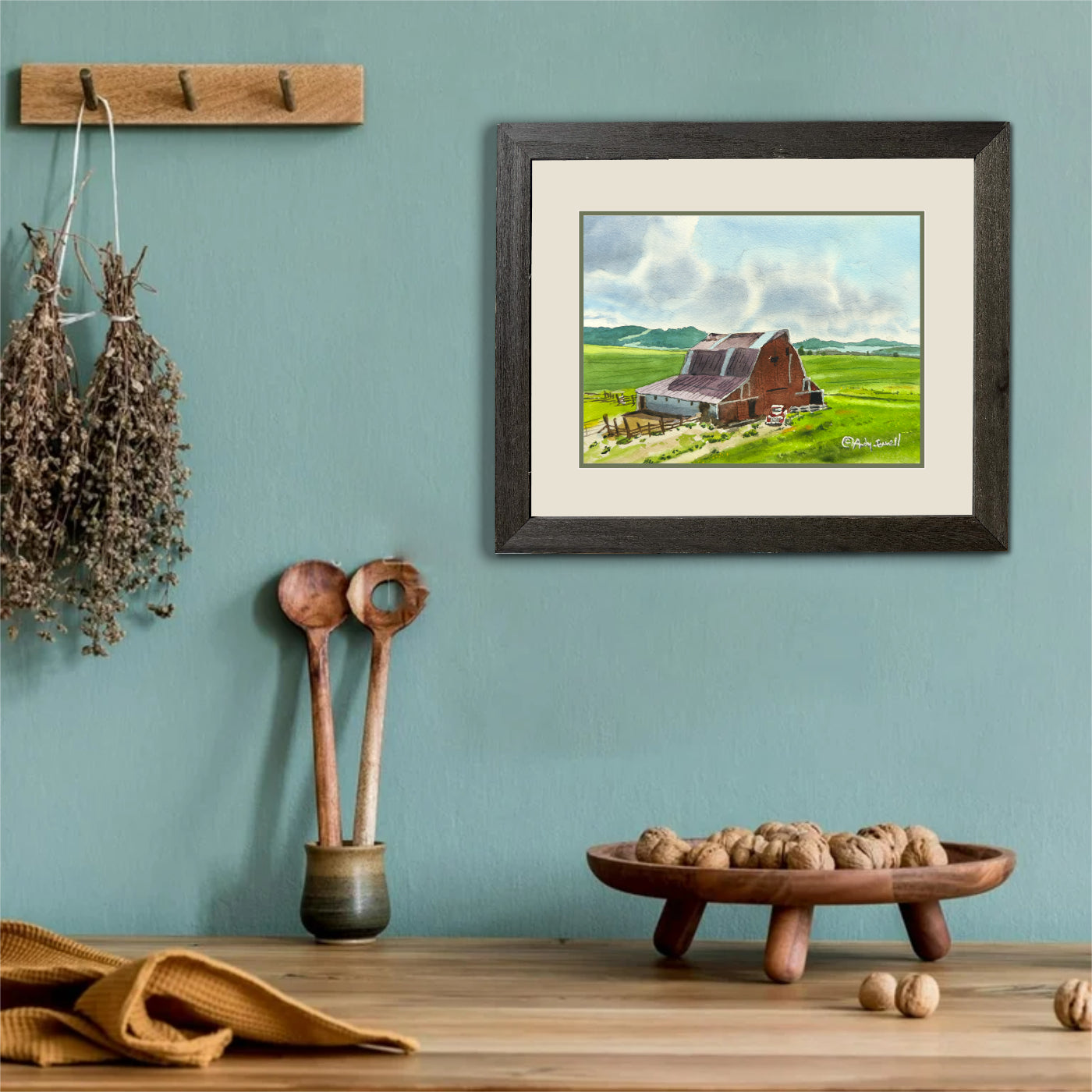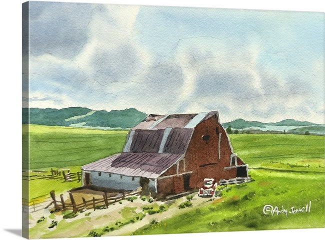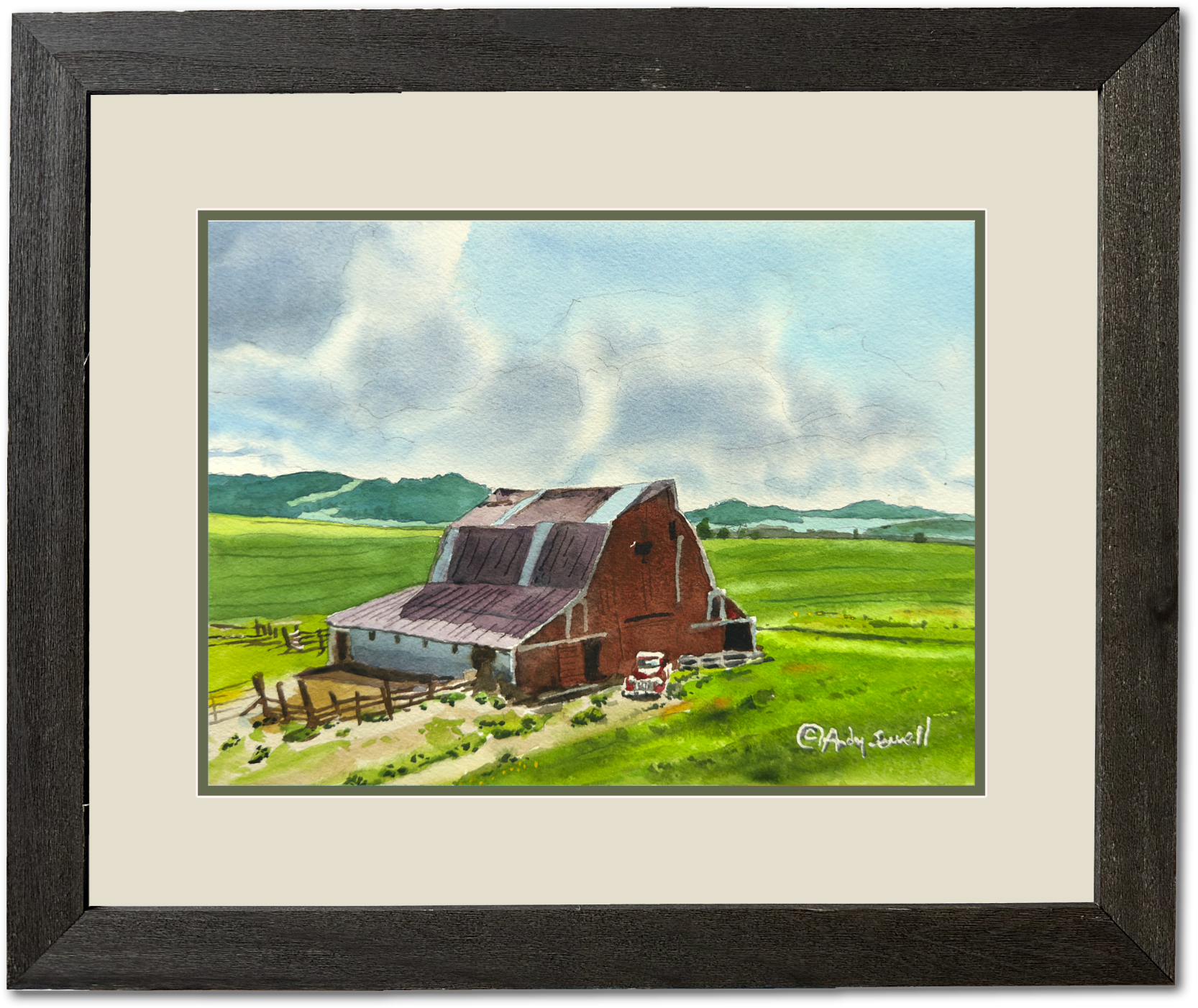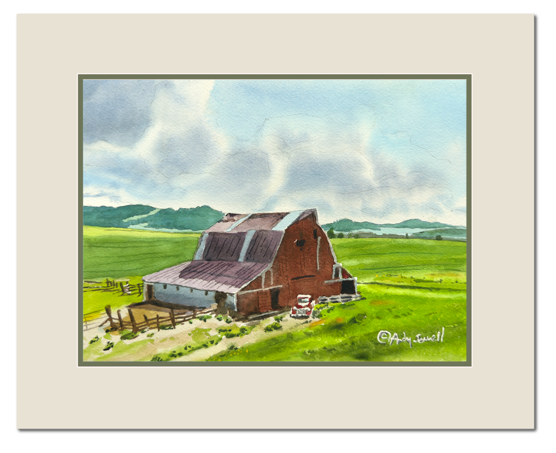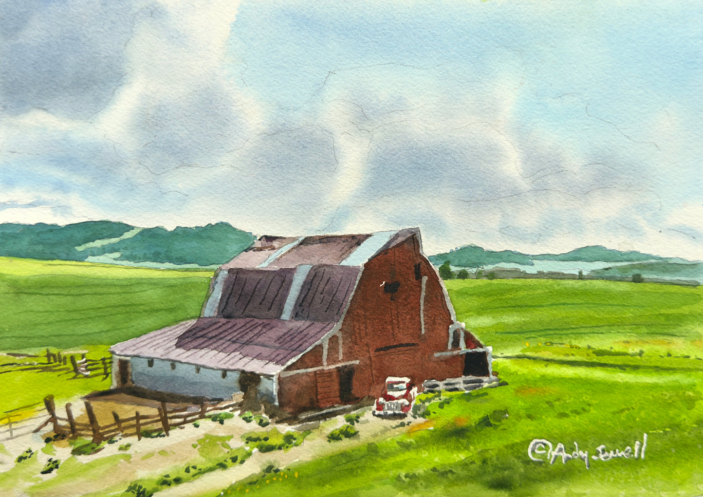 "Red Barn Red Truck Green Hills" - 7"x10" Original watercolor or signed edition giclee art print