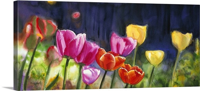 "Sunny Day Tulips" 18"x40" - a limited edition s/n giclee art print from an original watercolor of tulips glowing in the sun40"
