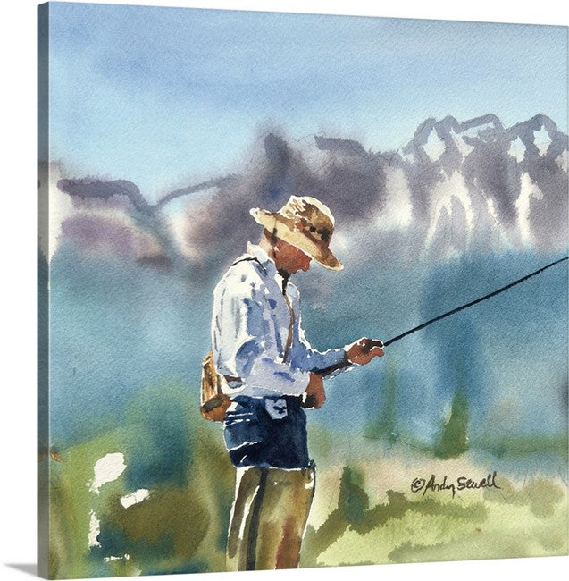 Title: "Reeling it in" This is a beautiful Original watercolor featuring fishing Idaho's Salmon River in the Sawtooth Mountains.