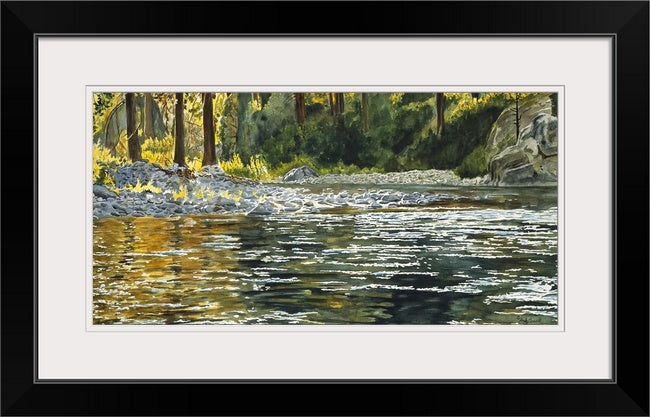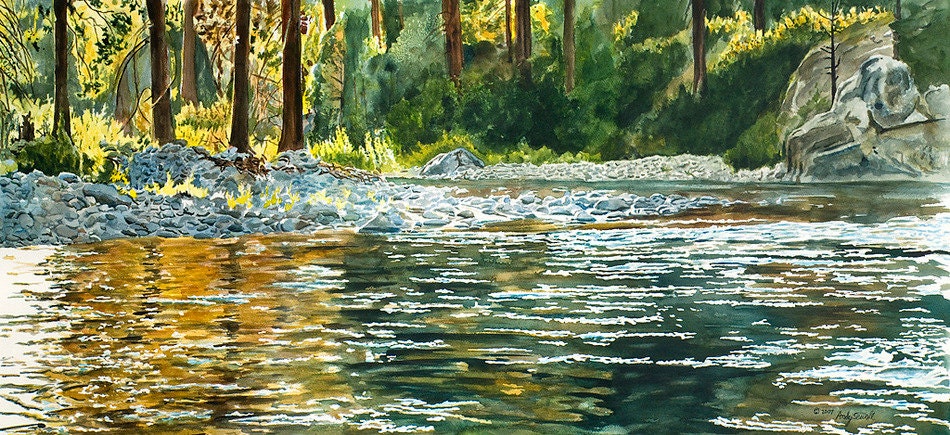 Title: “Peace of the River” This is a beautiful 18"x40" s/n ltd. edition print of my original watercolor featuring the evening sun on a trout fishing creek. The original is no longer available.