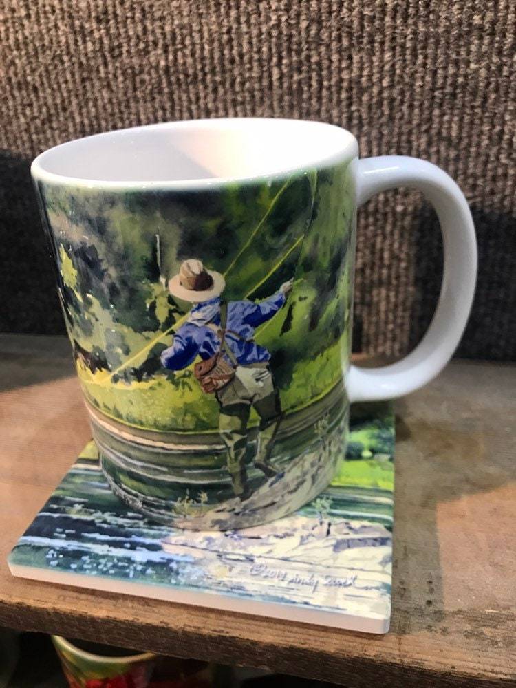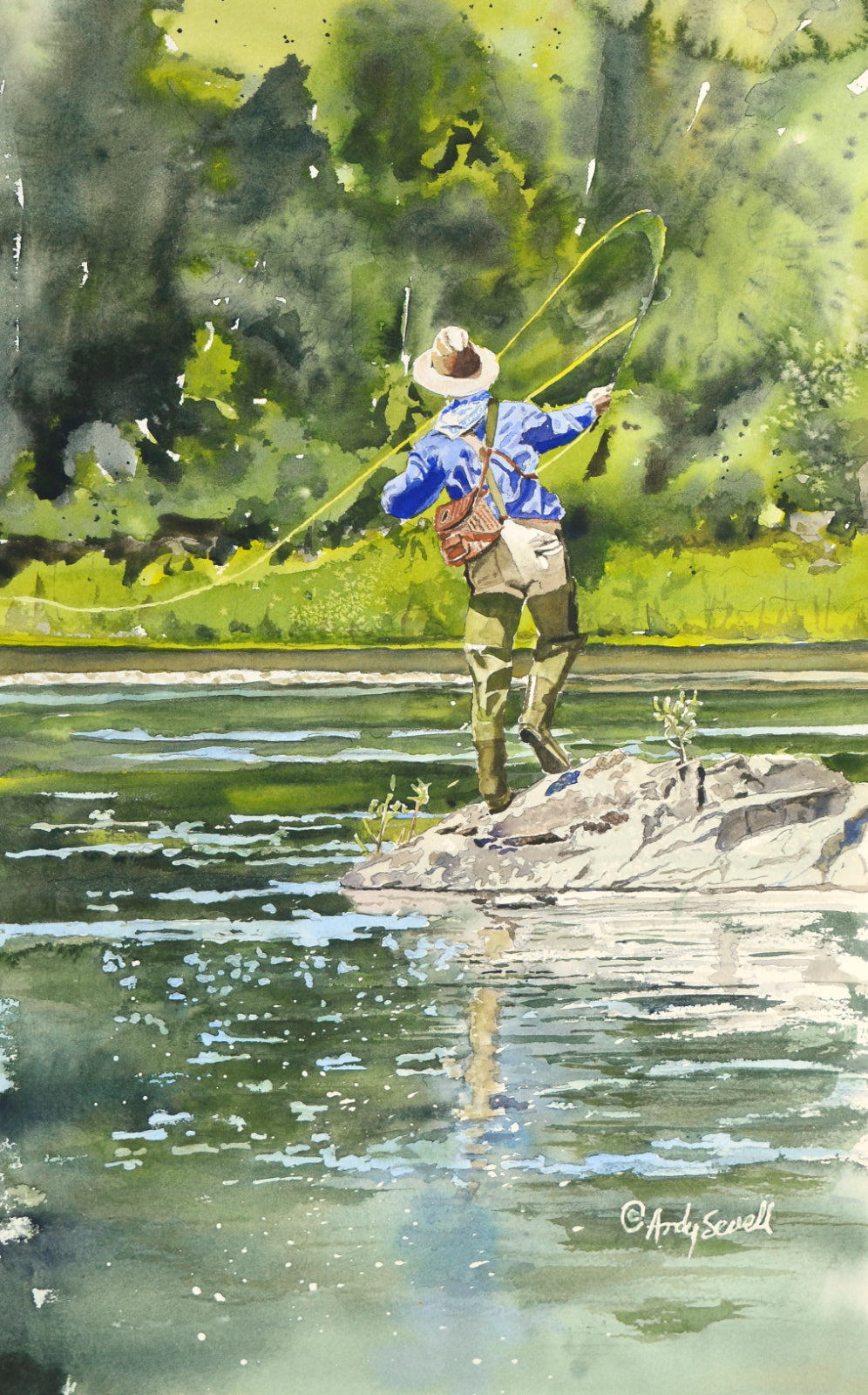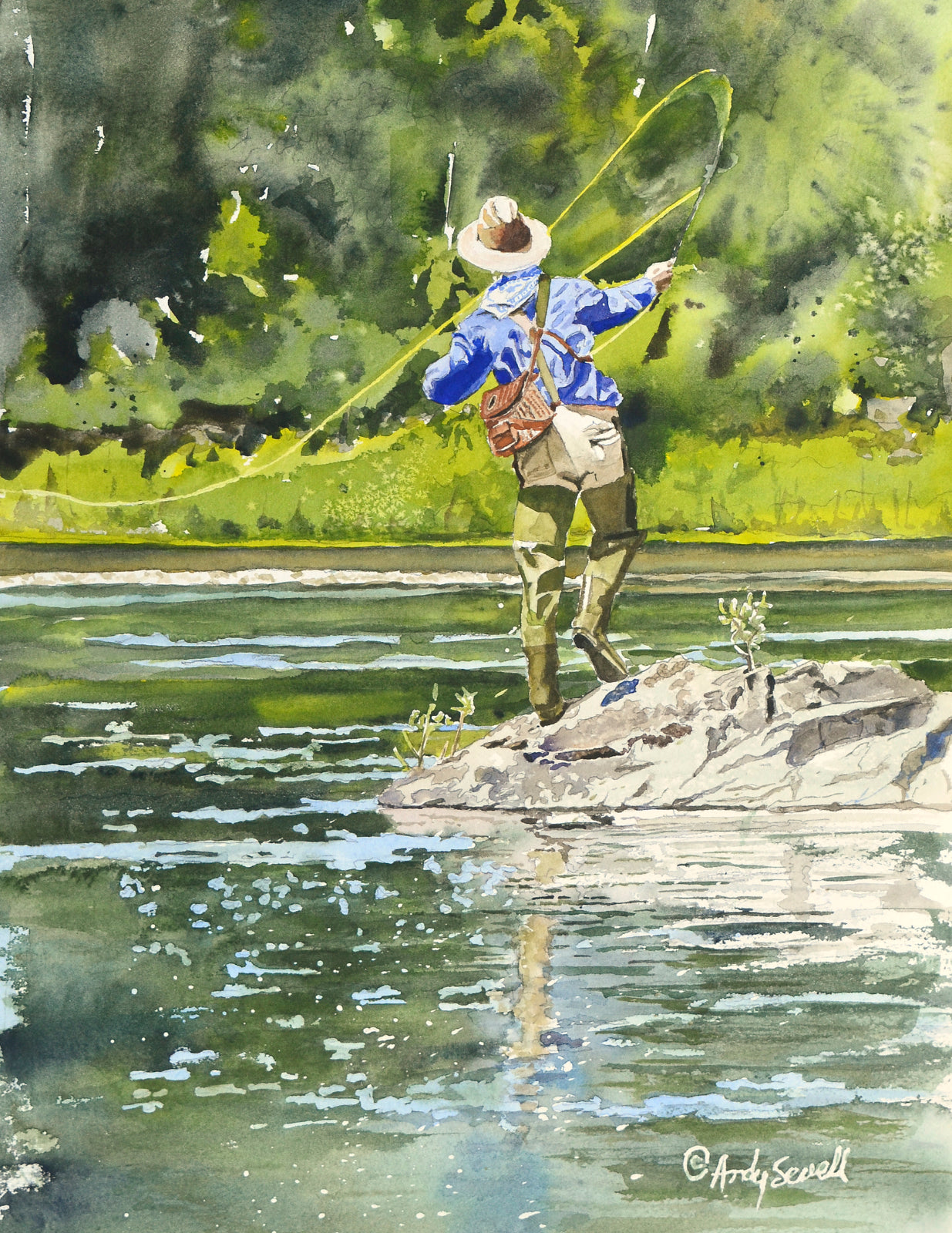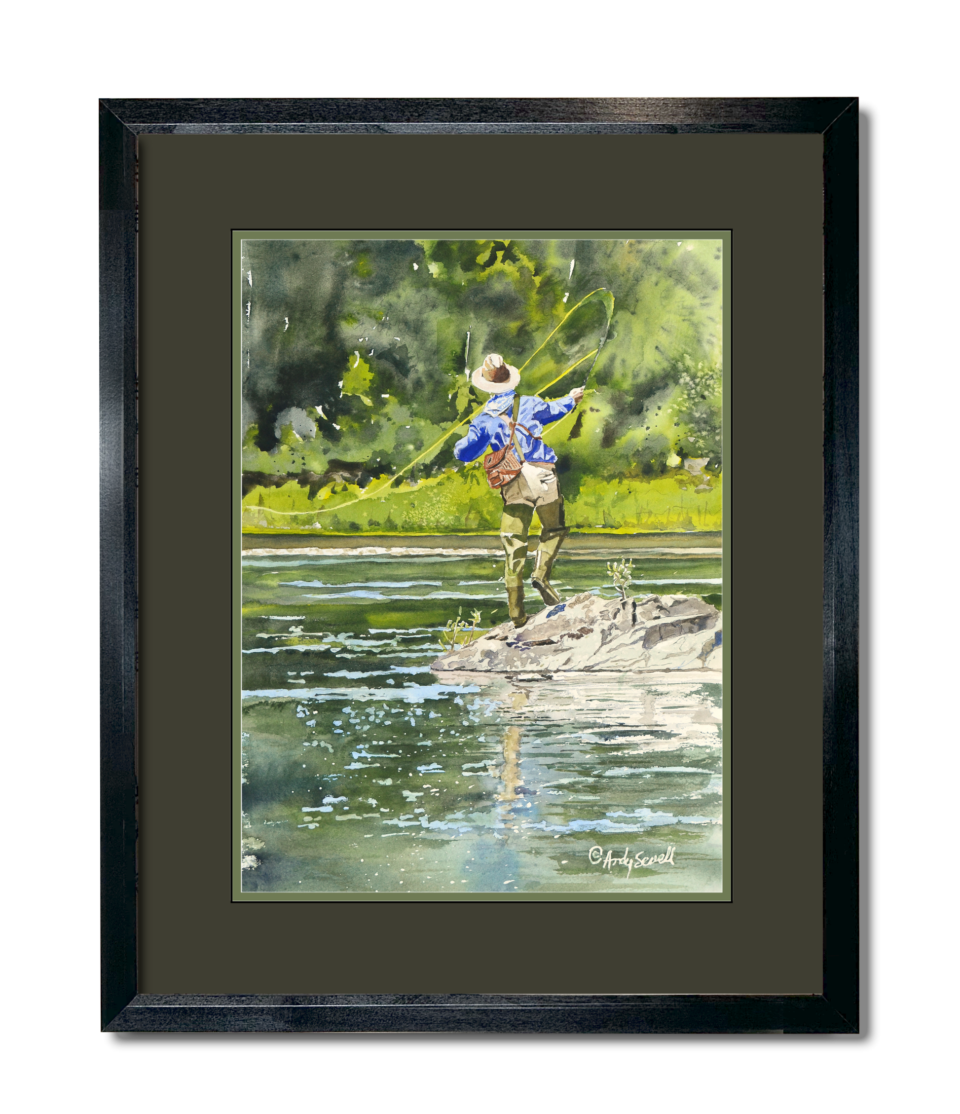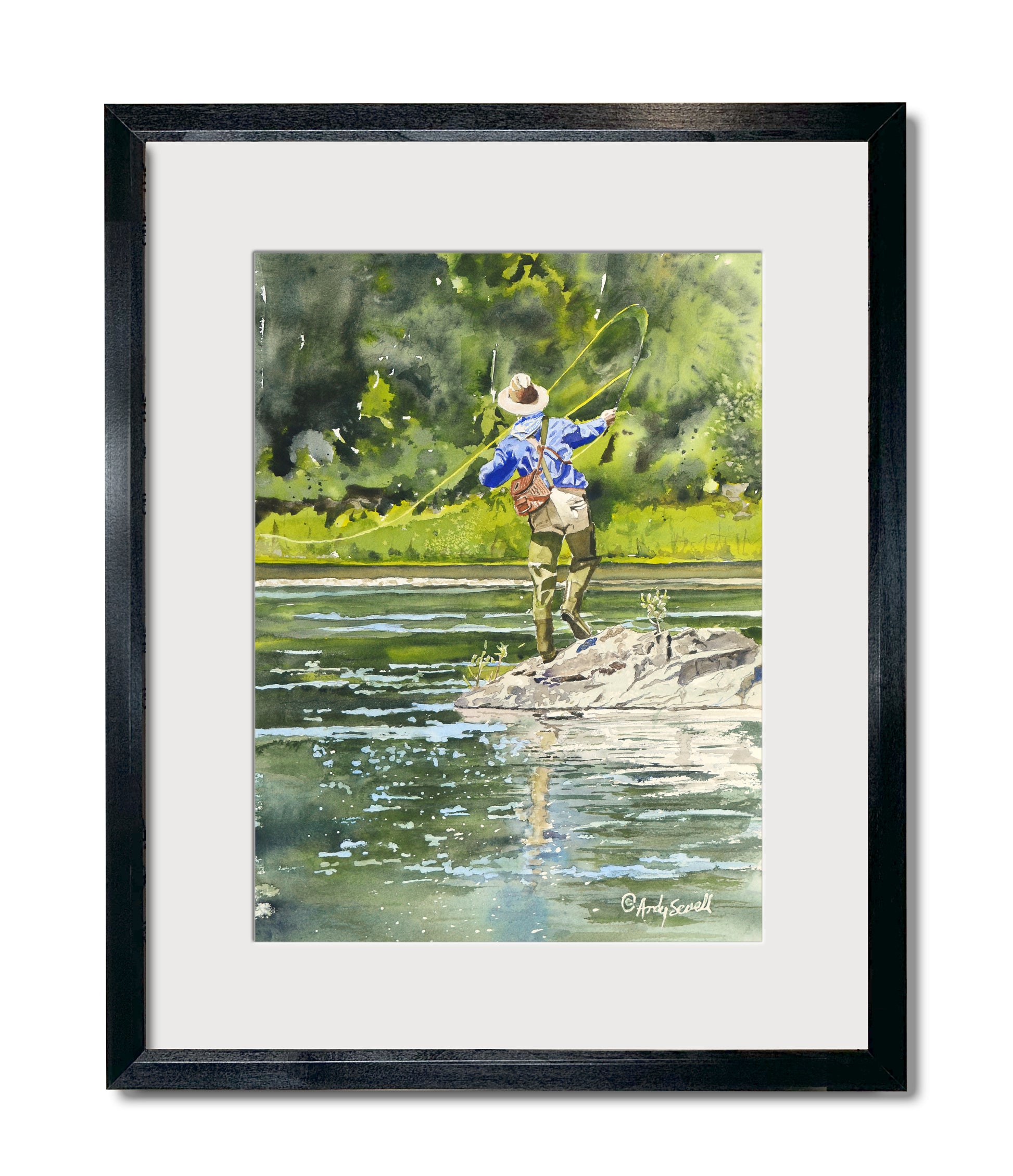 Vintage Fly Fisherman in "good form".This is a beautiful open edition print of my Original watercolor featuring my son fly fishing on a river in Idaho. I painted this image in both oil and watercolor.