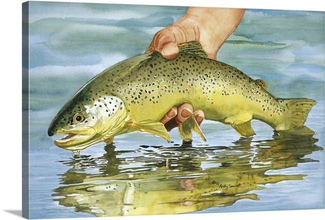 Title: "Slippery When Wet" This is a beautiful s/n ltd. edition print of my Original watercolor featuring a brown trout being released.