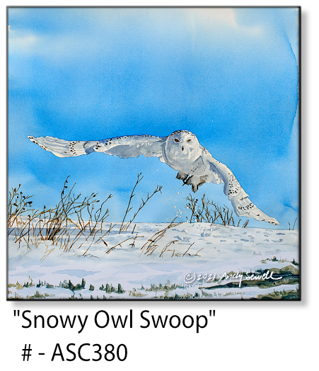 Title: "Snowy Owl Swoop” The prints are s/n ltd. editions of the watercolor featuring a Beautiful snowy owl in the winter cold swooping at some prey .