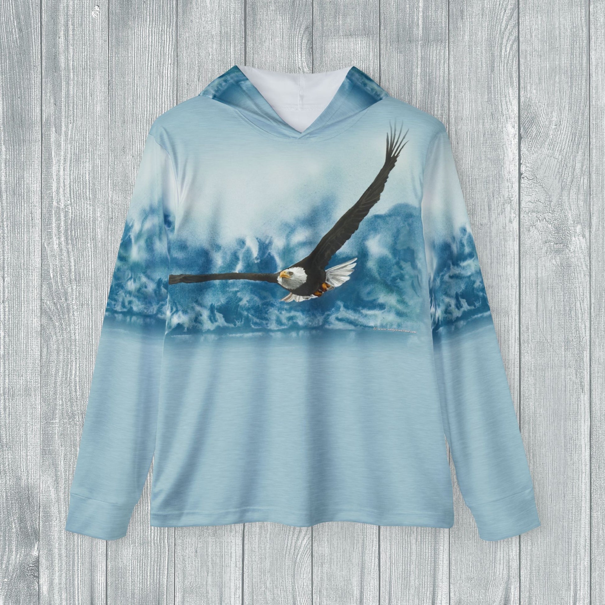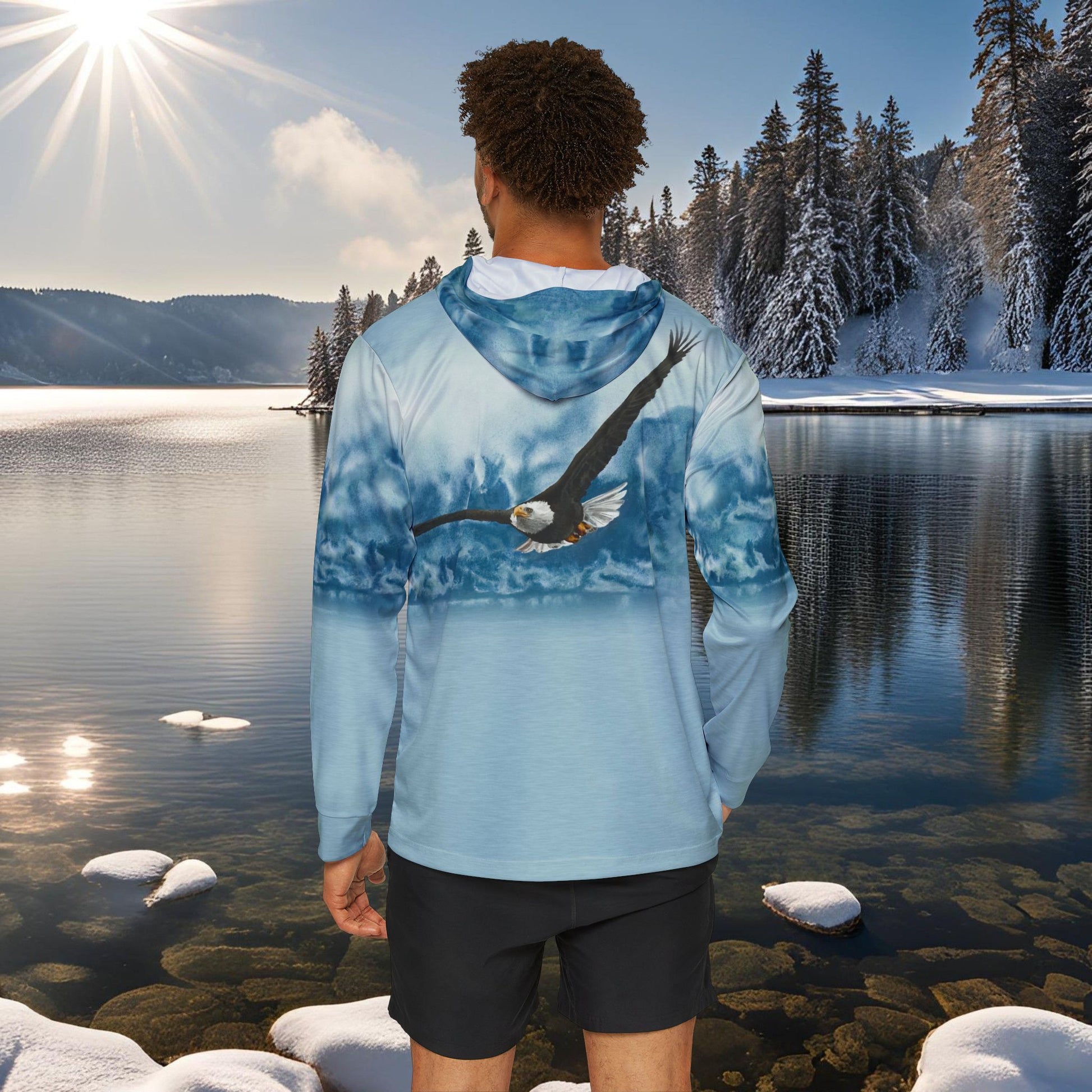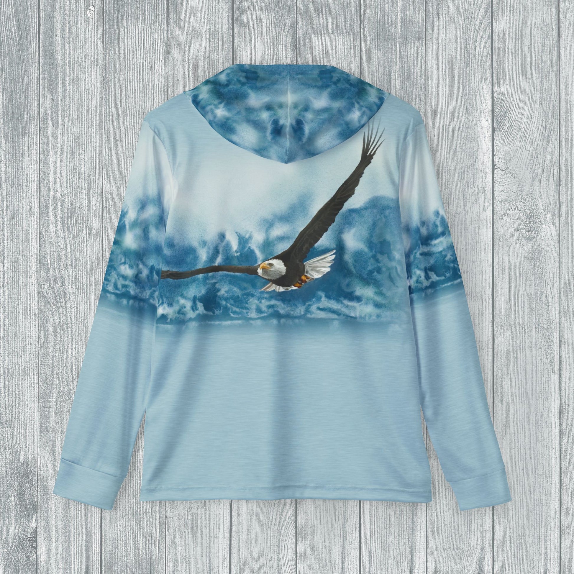Elevate your style and performance with this Men's Sports Warmup Hoodie featuring Andys Painting of a Bald eagle soaring over a lake in Idaho. Perfect for outdoor enthusiasts and athletes, this hoodie combines functionality with a stunning design. Ideal for activities like hiking, running, and working out, while also adding a touch of nature-inspired art to your wardrobe. Great for wildlife lovers, nature enthusiasts, and anyone who appreciates unique outdoor apparel. Perfect for gifts on birthdays, holidays, and special occasions.