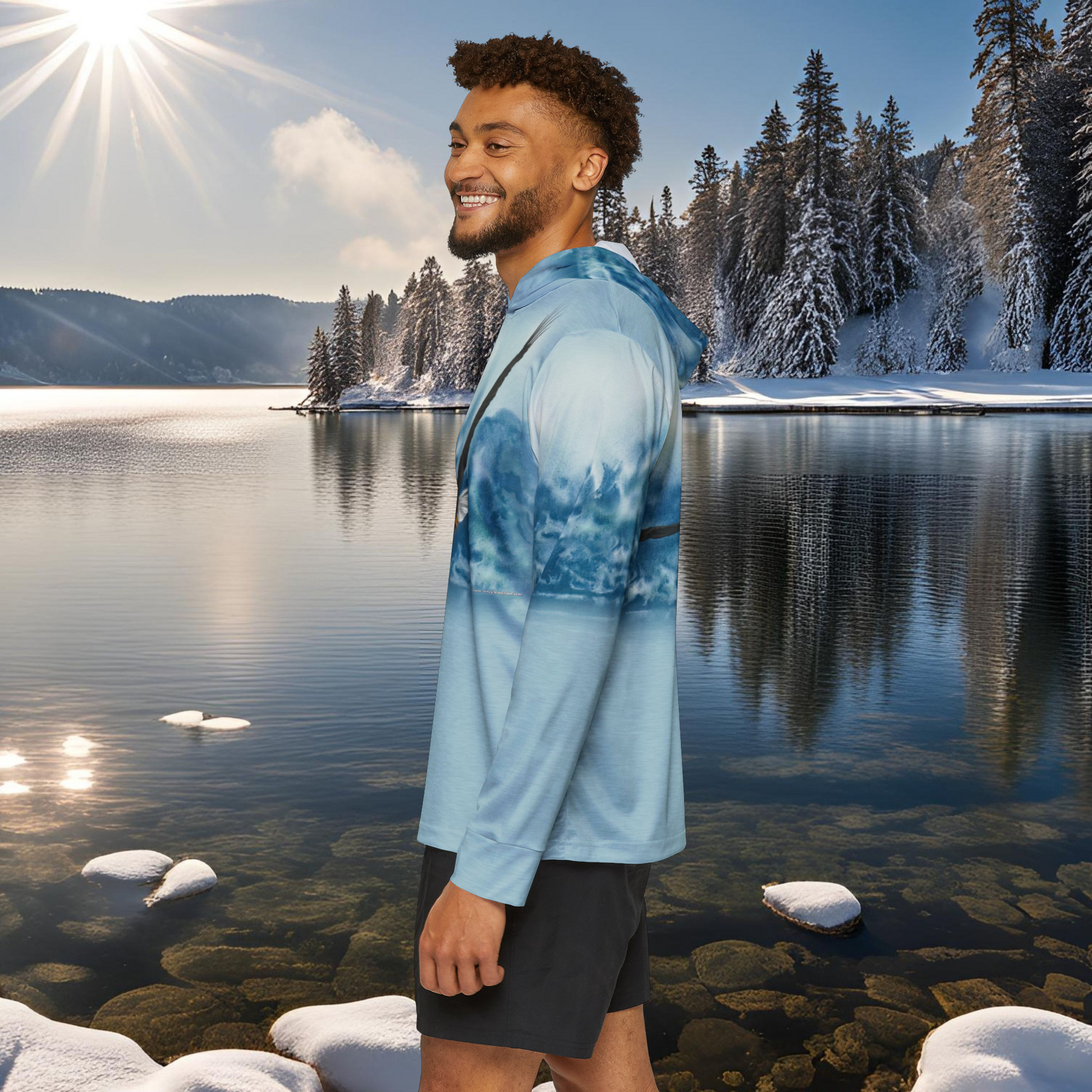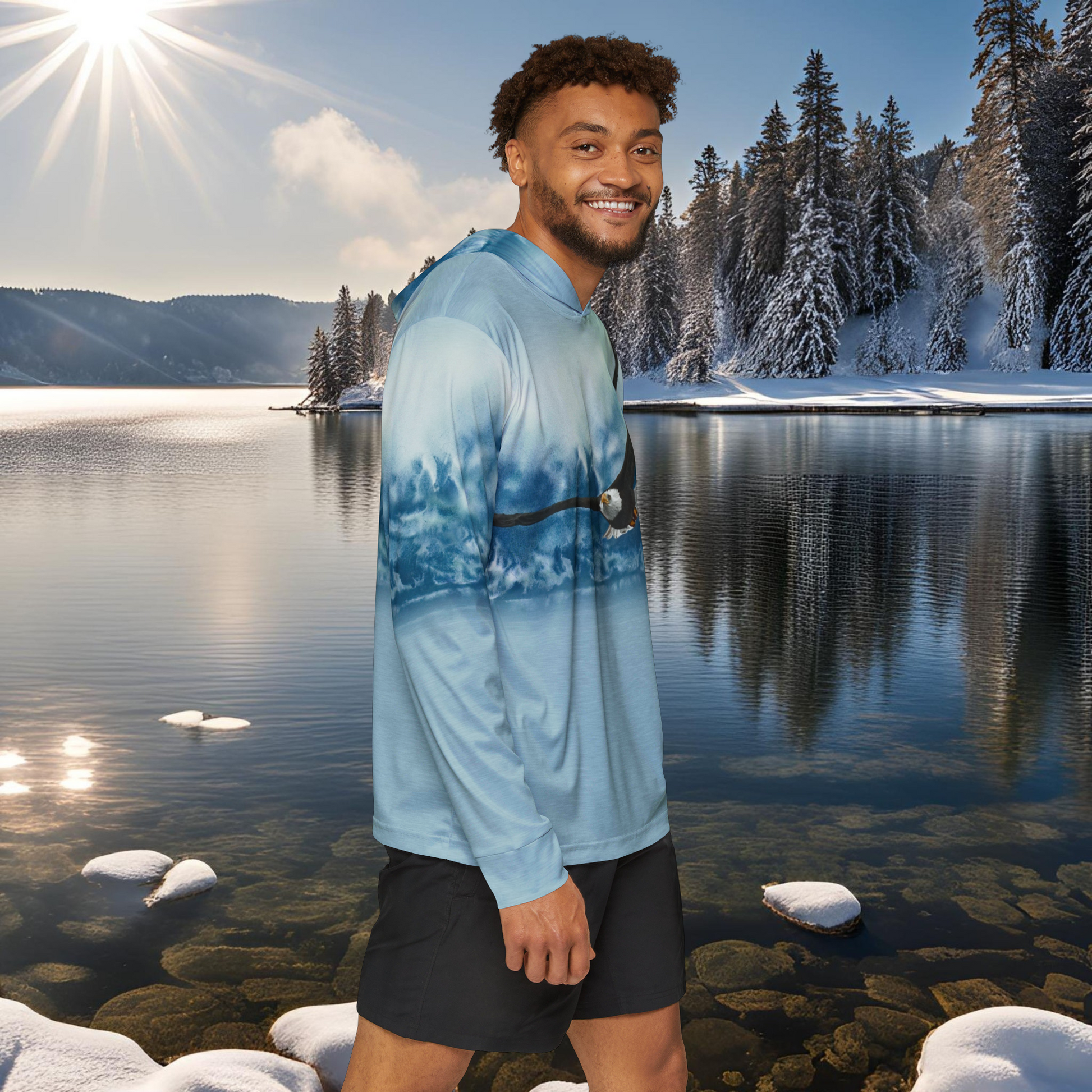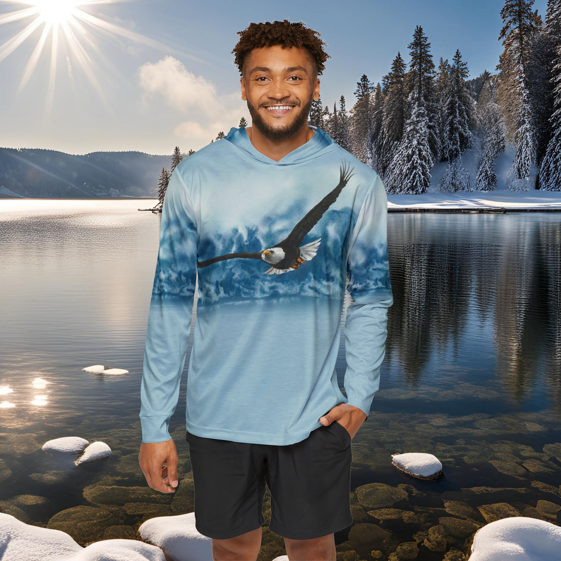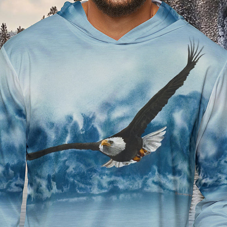 Elevate your style and performance with this Men's Sports Warmup Hoodie featuring Andys Painting of a Bald eagle soaring over a lake in Idaho. Perfect for outdoor enthusiasts and athletes, this hoodie combines functionality with a stunning design. Ideal for activities like hiking, running, and working out, while also adding a touch of nature-inspired art to your wardrobe. Great for wildlife lovers, nature enthusiasts, and anyone who appreciates unique outdoor apparel. Perfect for gifts on birthdays, holidays, and special occasions.
