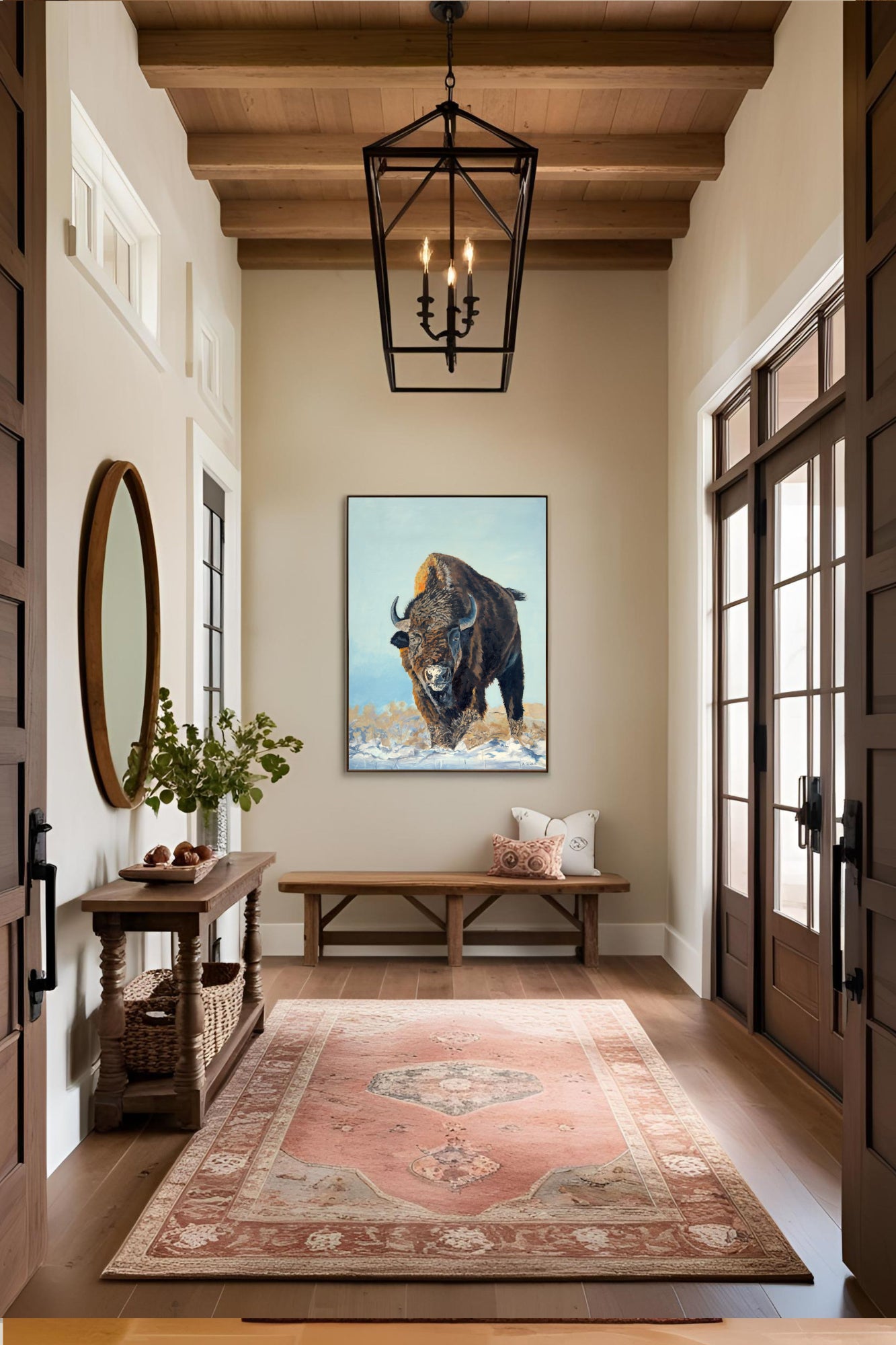 Title: "Thunder in the Snow“ This is a 36x48" Original oil on Panel. American Bison in winter snow. Various size prints also available.