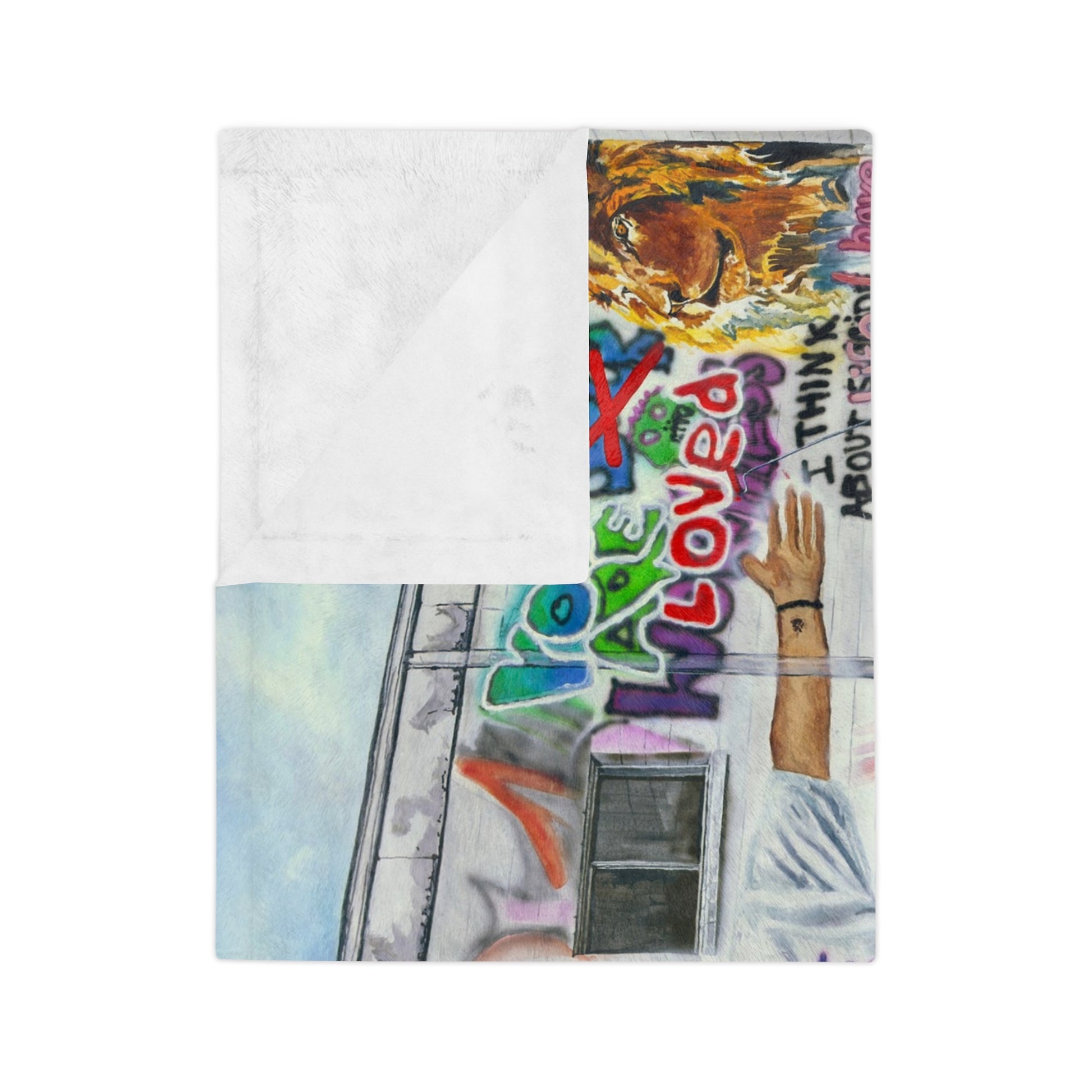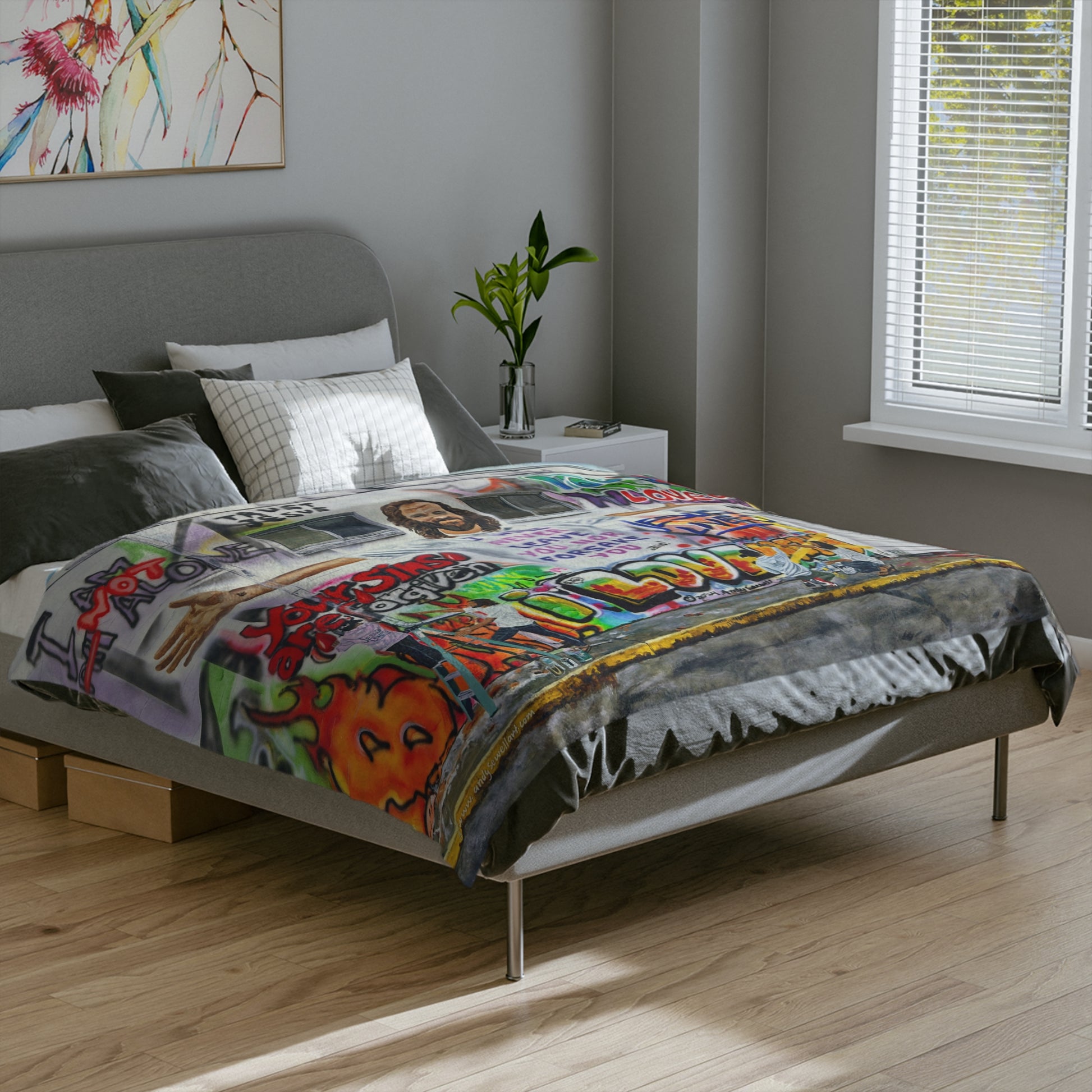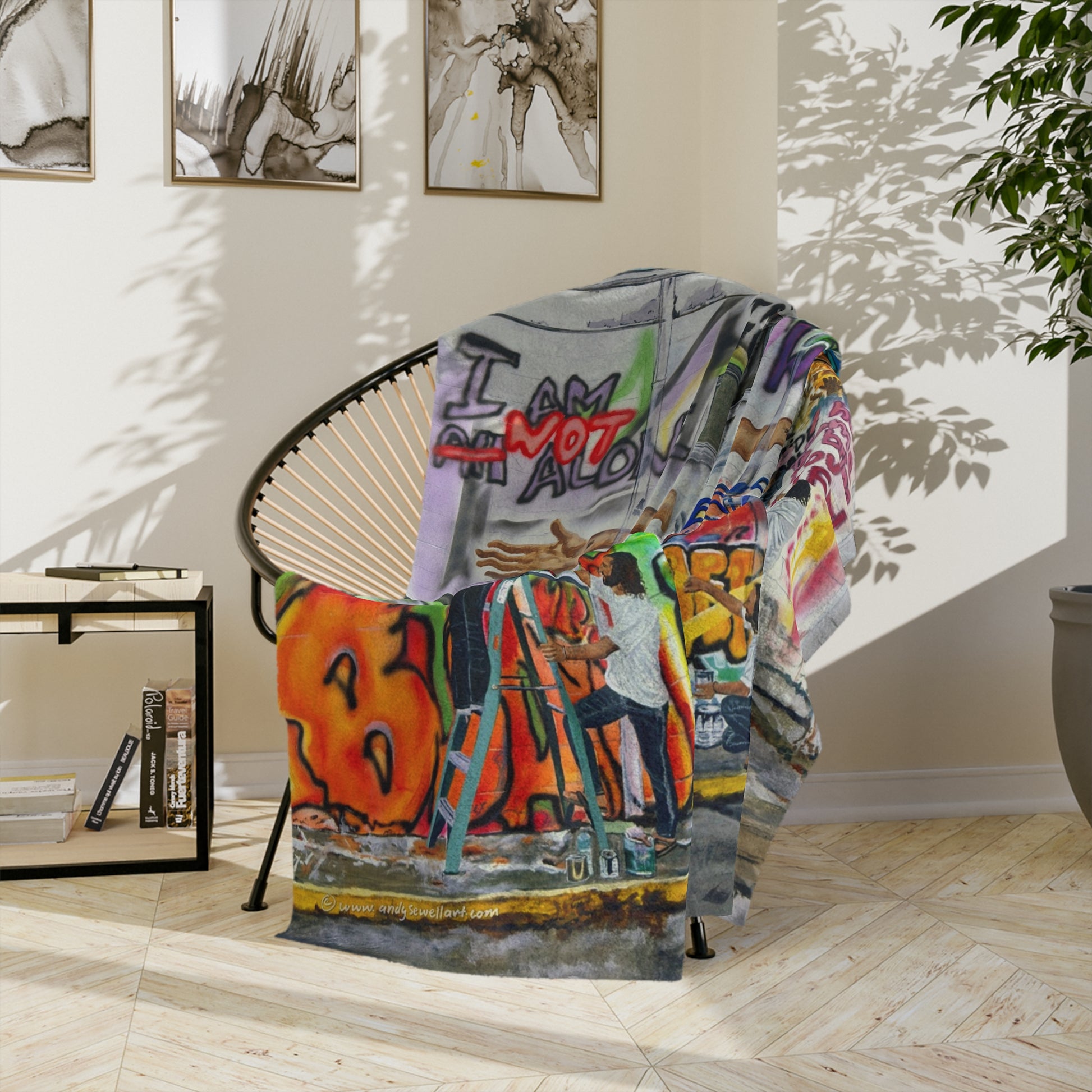 Stay warm and cozy with this velveteen blanket featuring Andy's Original painting of 'Painting Graffiti with Jesus'. Perfect for art enthusiasts and those who appreciate unique designs. Ideal for adding a pop of color to your home decor or giving as a thoughtful gift for birthdays or housewarmings.
