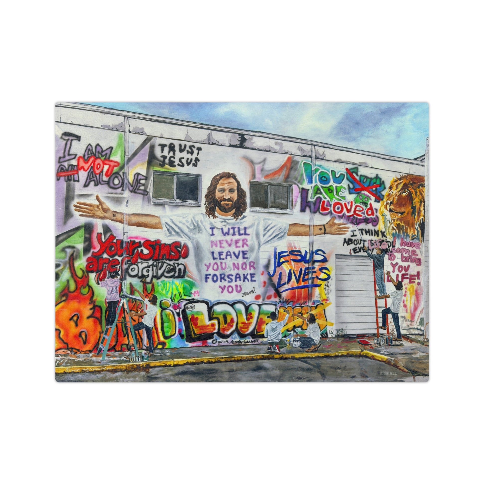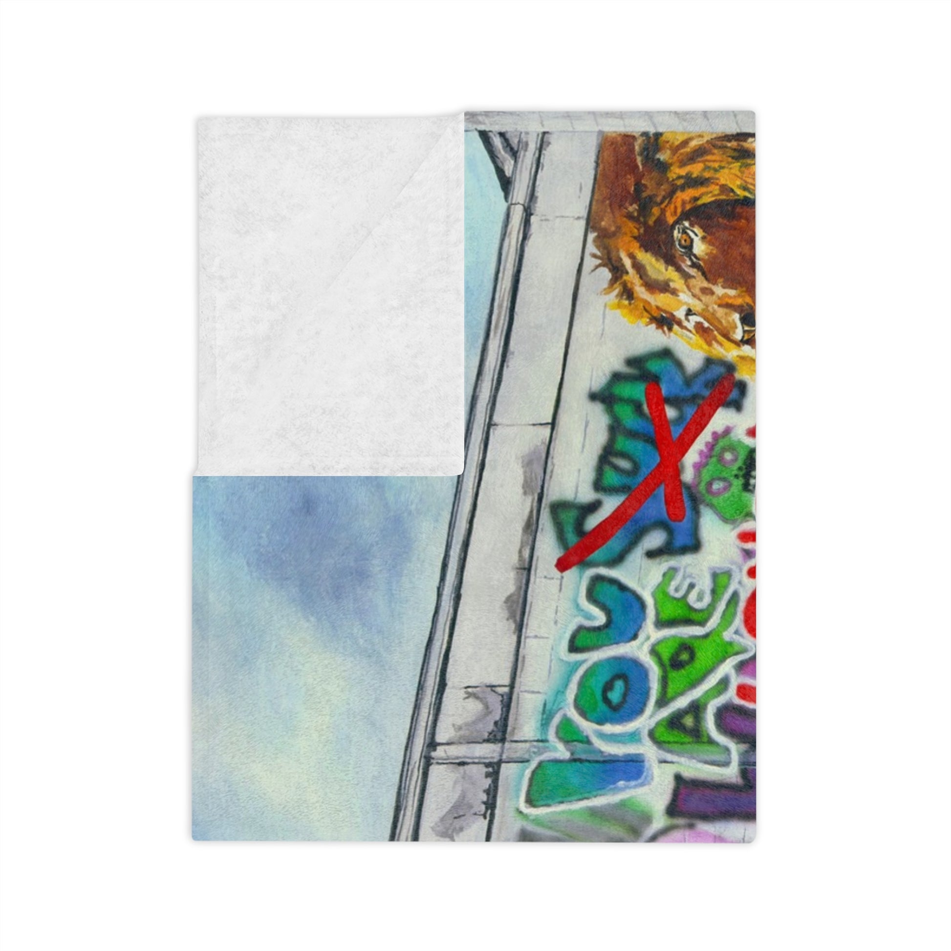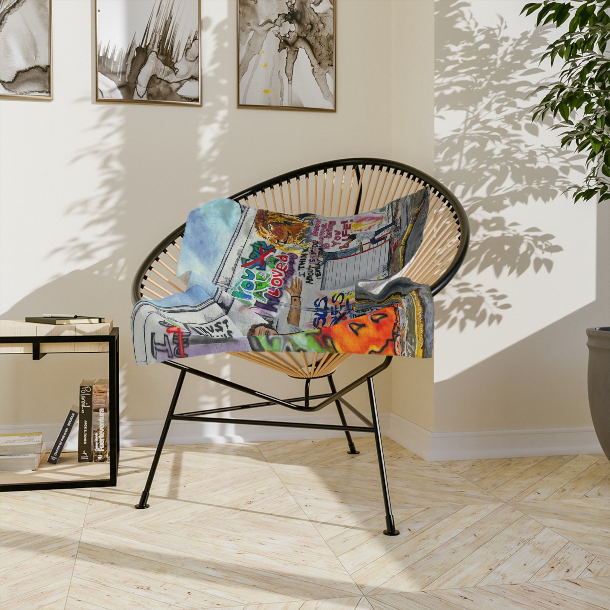 Stay warm and cozy with this velveteen blanket featuring Andy's Original painting of 'Painting Graffiti with Jesus'. Perfect for art enthusiasts and those who appreciate unique designs. Ideal for adding a pop of color to your home decor or giving as a thoughtful gift for birthdays or housewarmings.