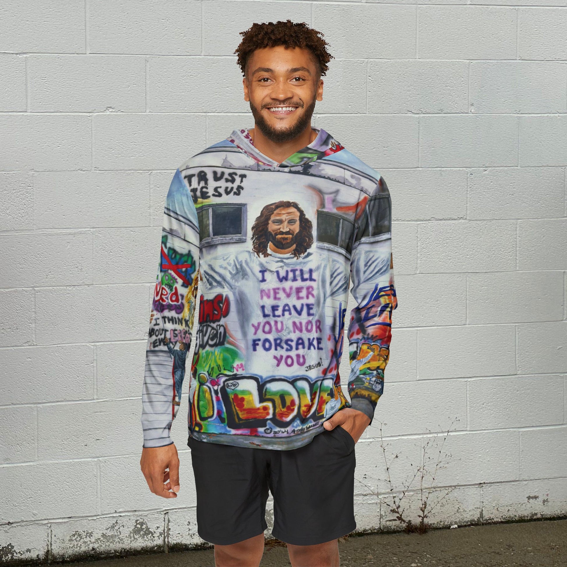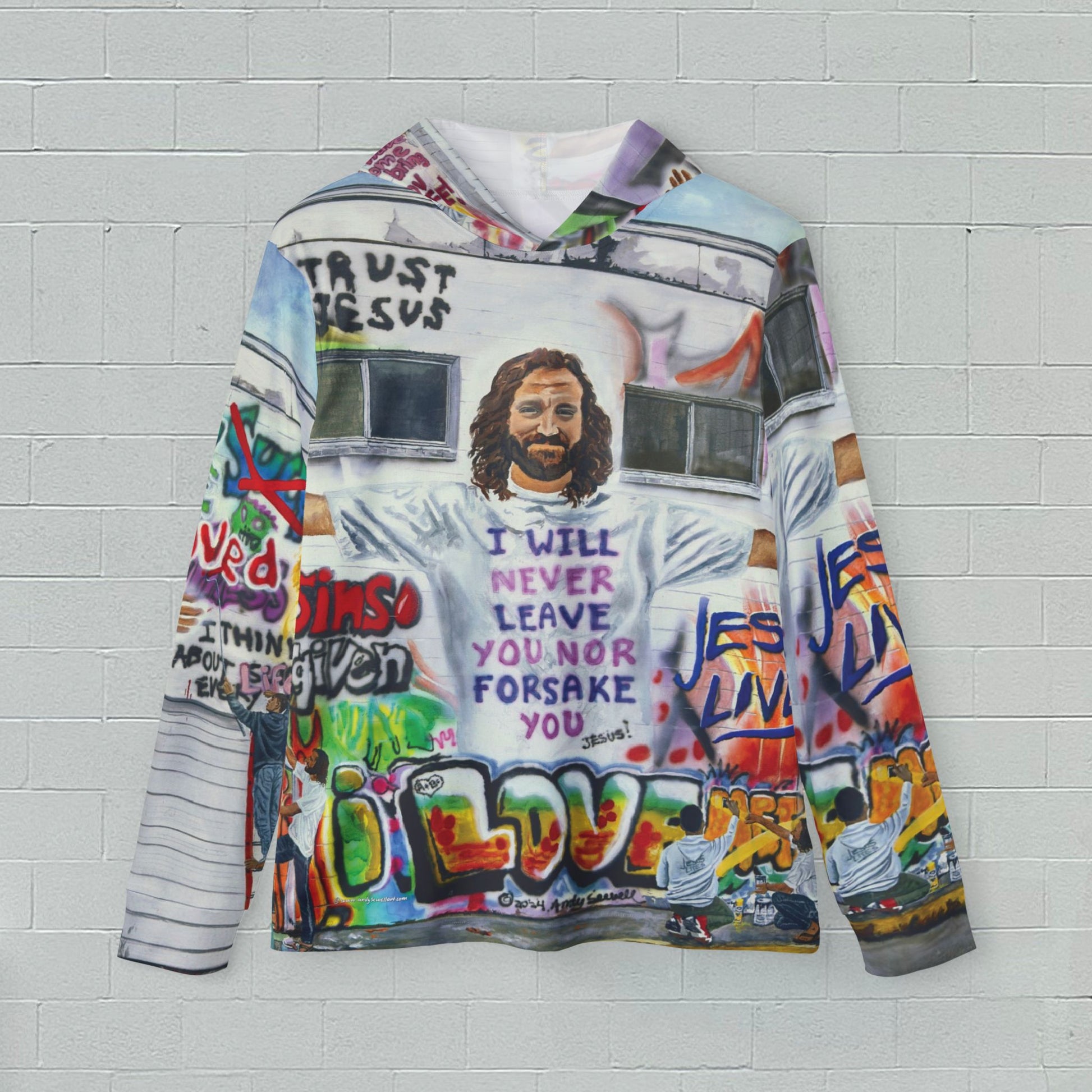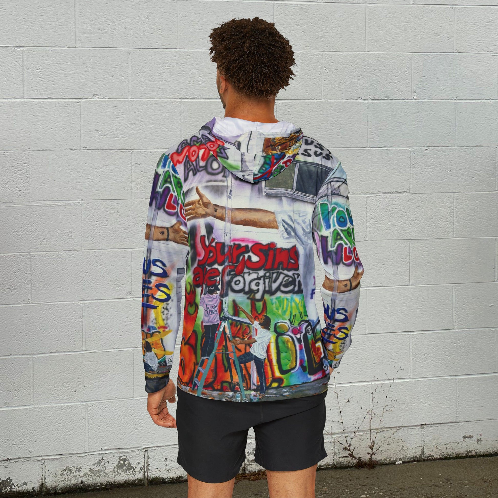 A sun sports hoodie featuring the original mixed media artwork by Andy "Painting Graffiti with Jesus" where Jesus is helping kids paint over lies and changing them to the Truth. This hoodie gives off a positive and empowering vibe, perfect for those who want to spread a message of hope and transformation. Ideal for sports warmups or casual wear, this hoodie is relevant and a great gift for any follower of Jesus