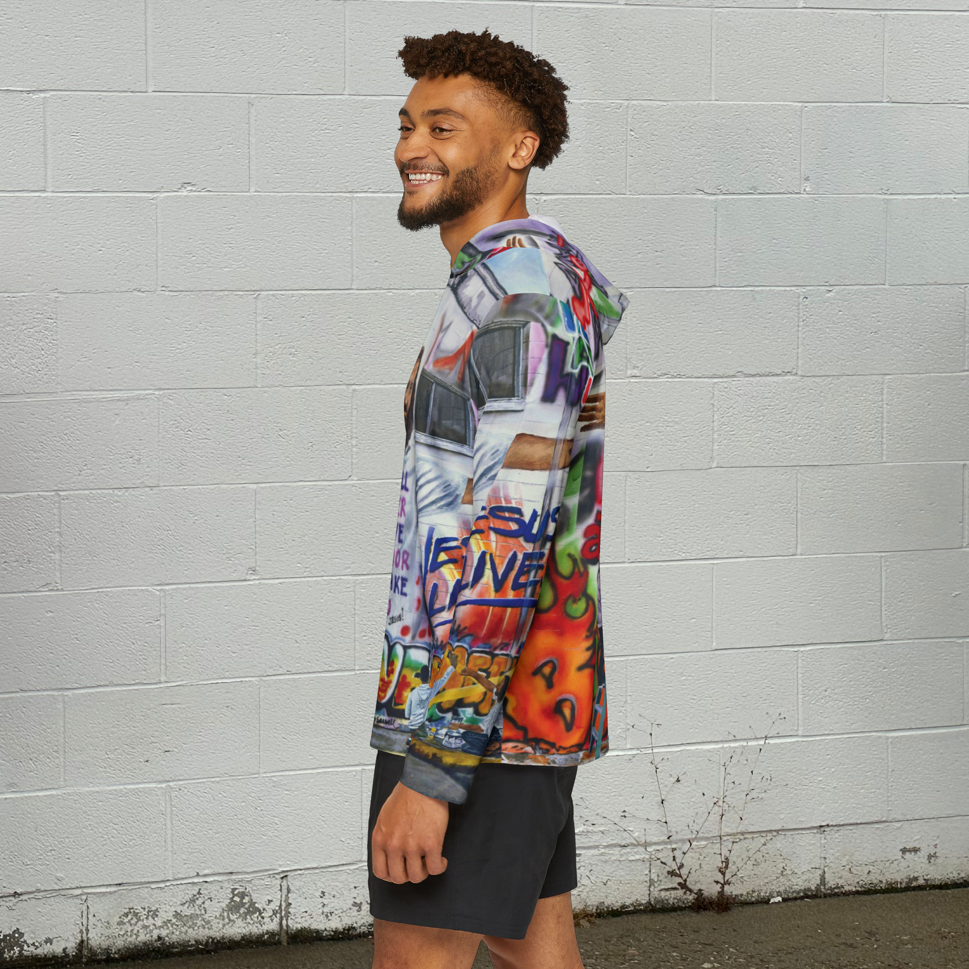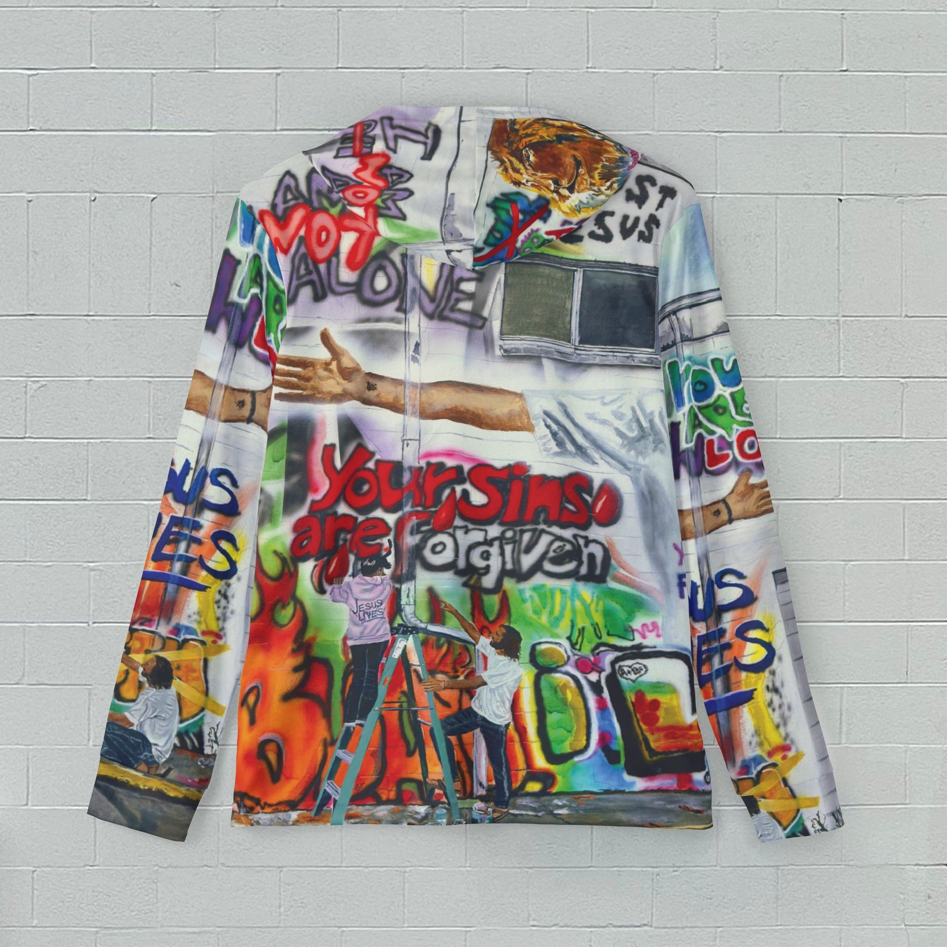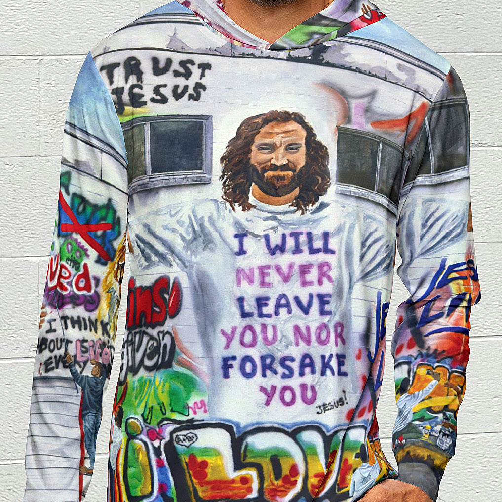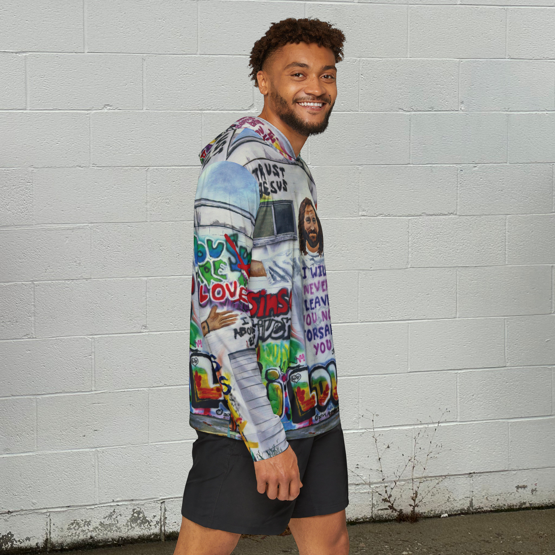 A sun sports hoodie featuring the original mixed media artwork by Andy "Painting Graffiti with Jesus" where Jesus is helping kids paint over lies and changing them to the Truth. This hoodie gives off a positive and empowering vibe, perfect for those who want to spread a message of hope and transformation. Ideal for sports warmups or casual wear, this hoodie is relevant and a great gift for any follower of Jesus